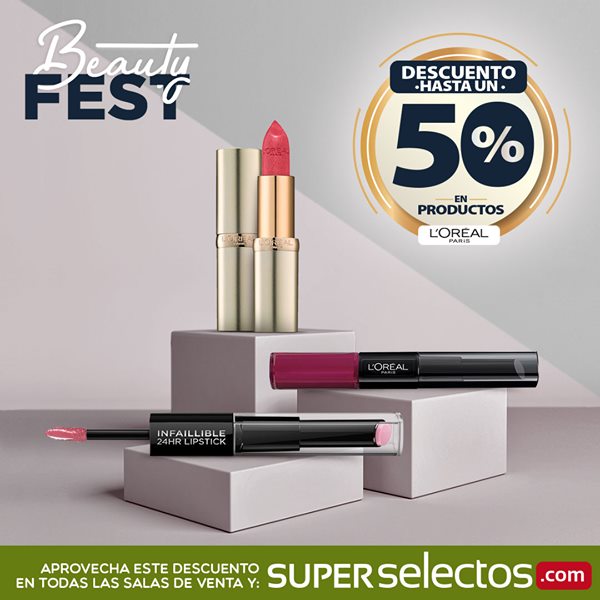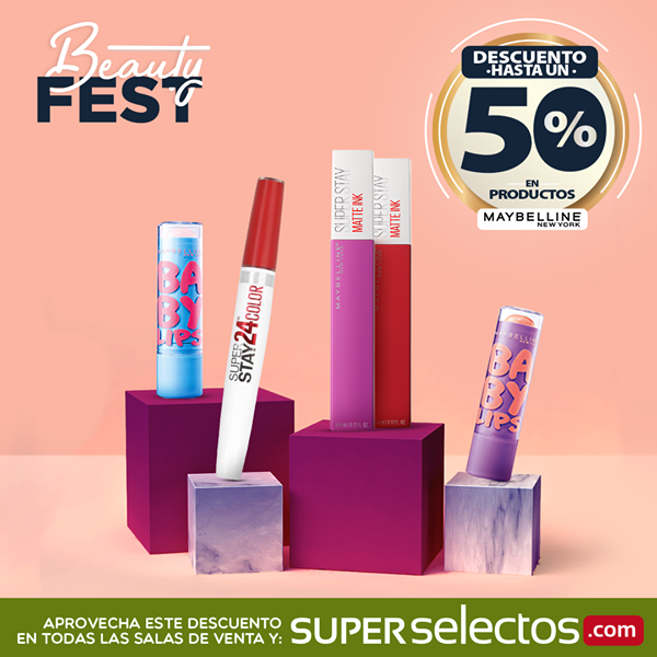 Ven al #BeautyFest este 7 al 9 de febrero y disfruta de hasta un 50% de descuento en productos para labios Maybelline New York y L’Oréal Paris solo en Súper Selectos y superselectos .com 😊