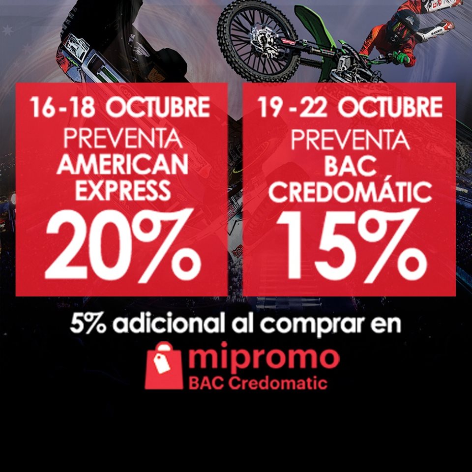 Del 16 al 18 de Octubre 20% al comprar con tu tarjeta de crédito AMERICAN EXPRESS y del 19 al 22 de Octubre 15% al comprar con tus tarjetas de BAC Credomatic.