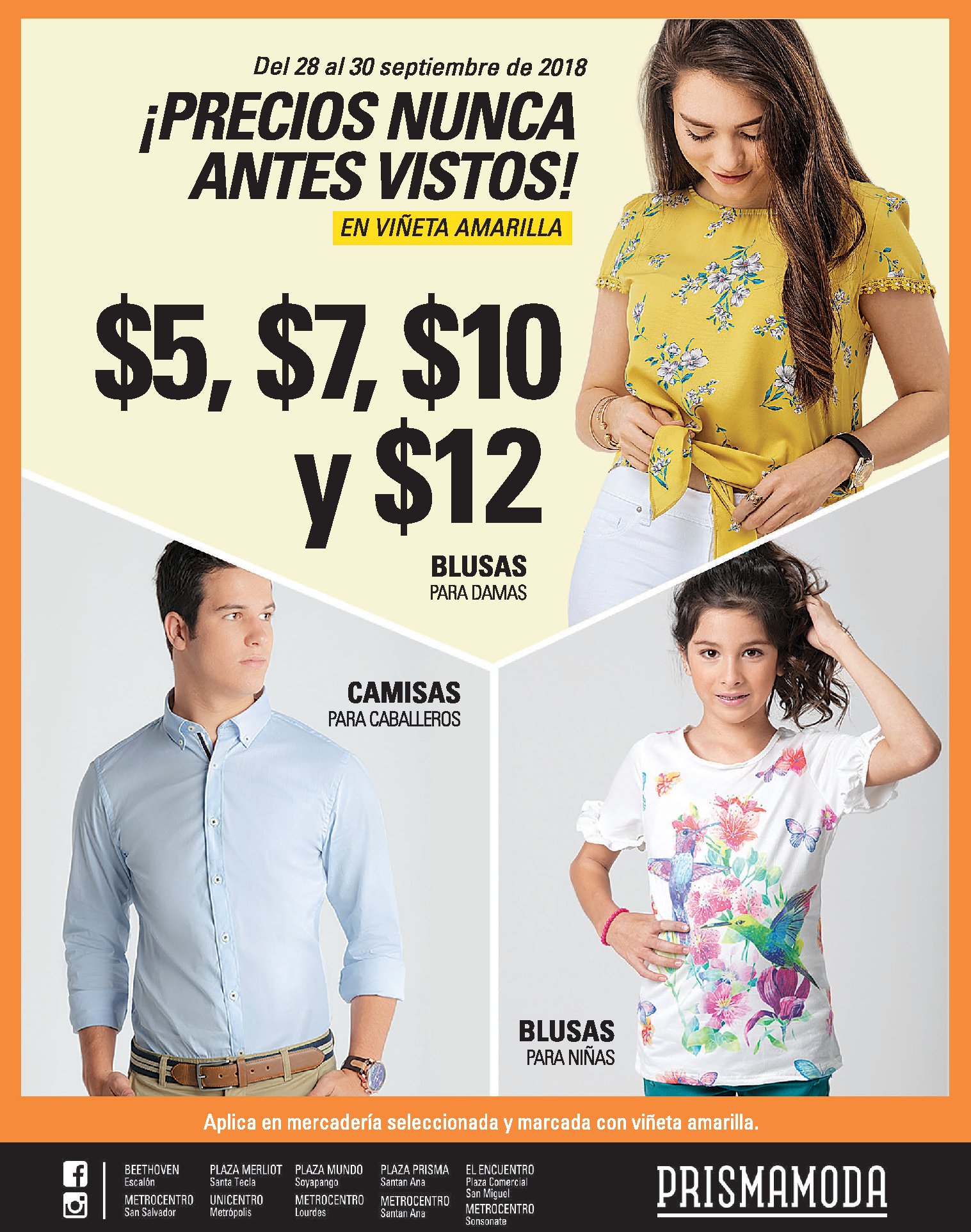 Almacenes Prisma Moda el salvador te invita a aprovechar esta promoción en blusas para damas, camisas para caballeros y blusas para niñas. Aplica en mercadería seleccionada y marcada con viñeta amarilla. *Tienes del 28 al 30 de septiembre.