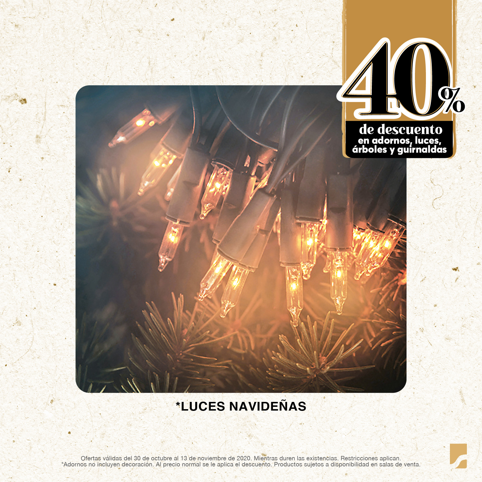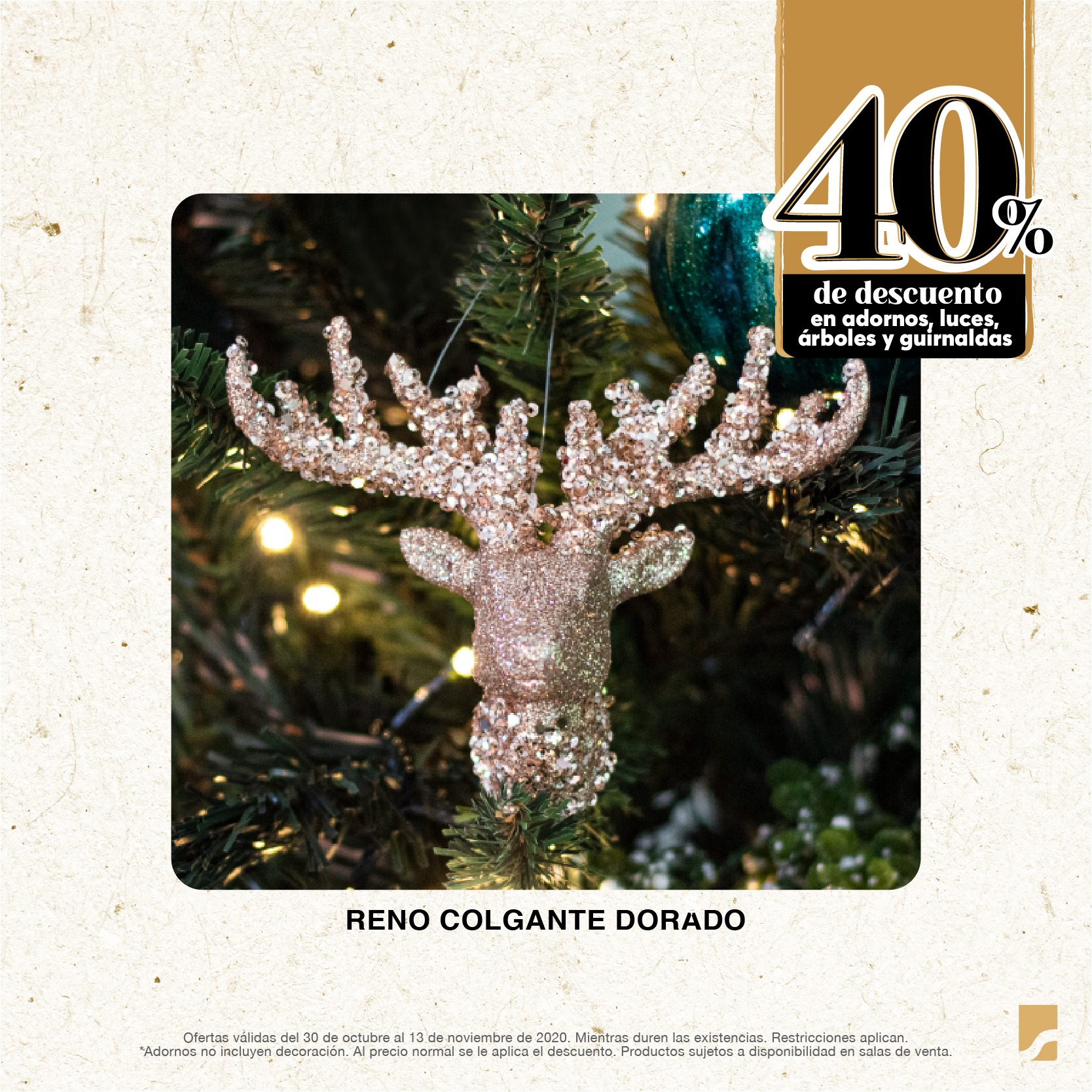 Ofertas válidas del 30 de octubre al 13 de noviembre de 2020. Mientras duren las existencias. Restricciones aplican. *Adornos no incluyen decoración. Al precio normal se le aplica el descuento. Productos sujetos a disponibilidad en salas de venta.