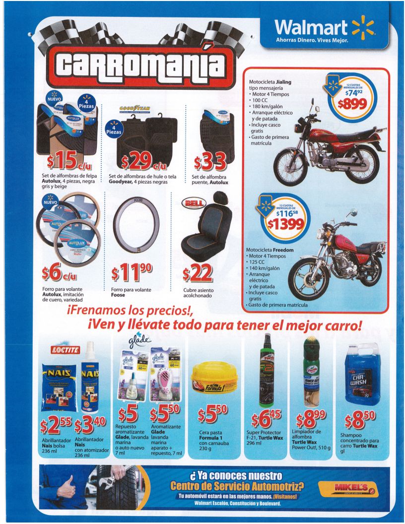 «ACELERA con tu racing car WALMART low prices on tires» «Racing automobile promotions WALMART auto deals» «Centro de servicio automotriz MIKELS power by WALMART» «Lubricantes aditivos acceosrios BUSCALOS sin pagar mas en WALMART» «promociones WALMART folleto CARROMANIA 2015»