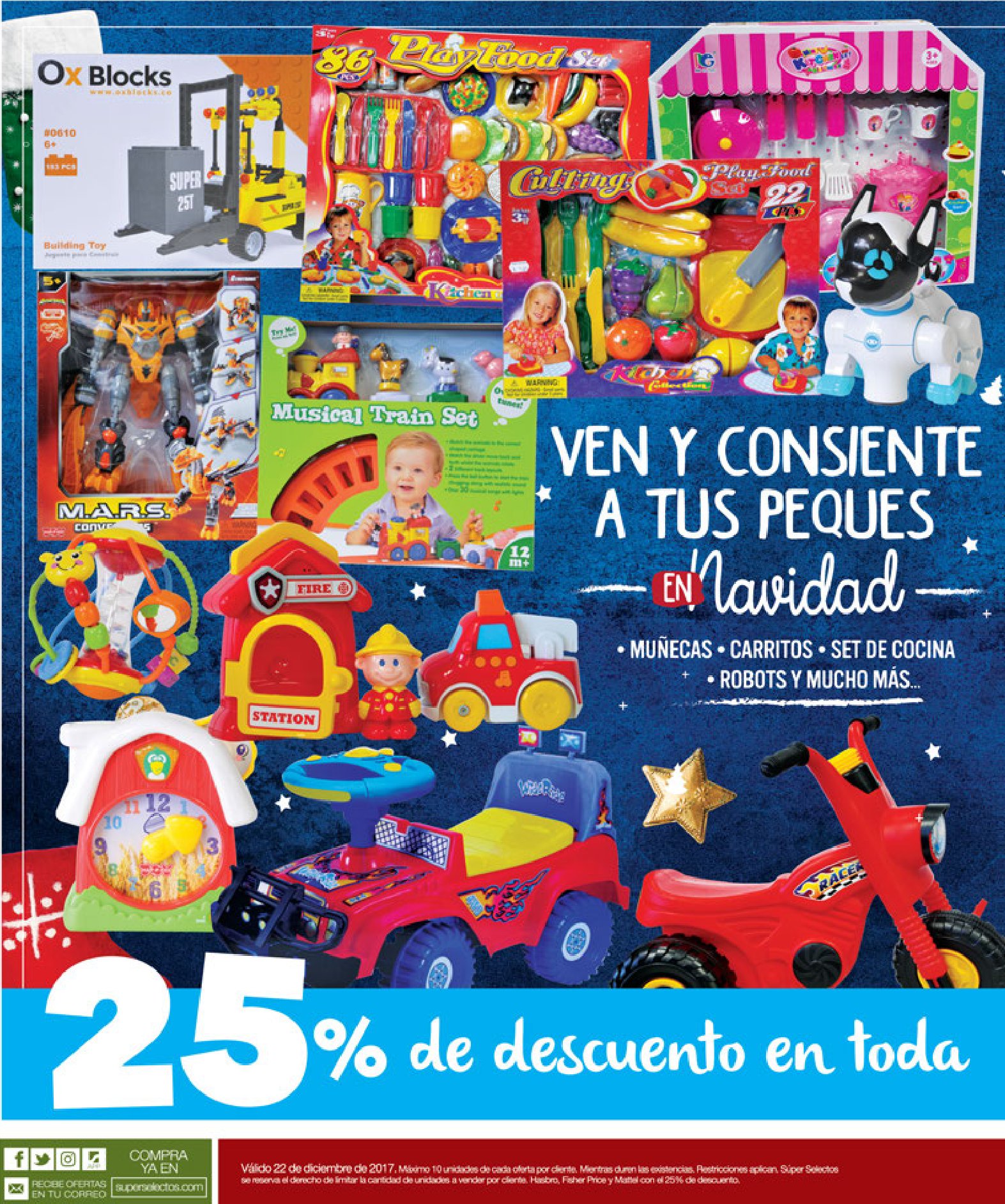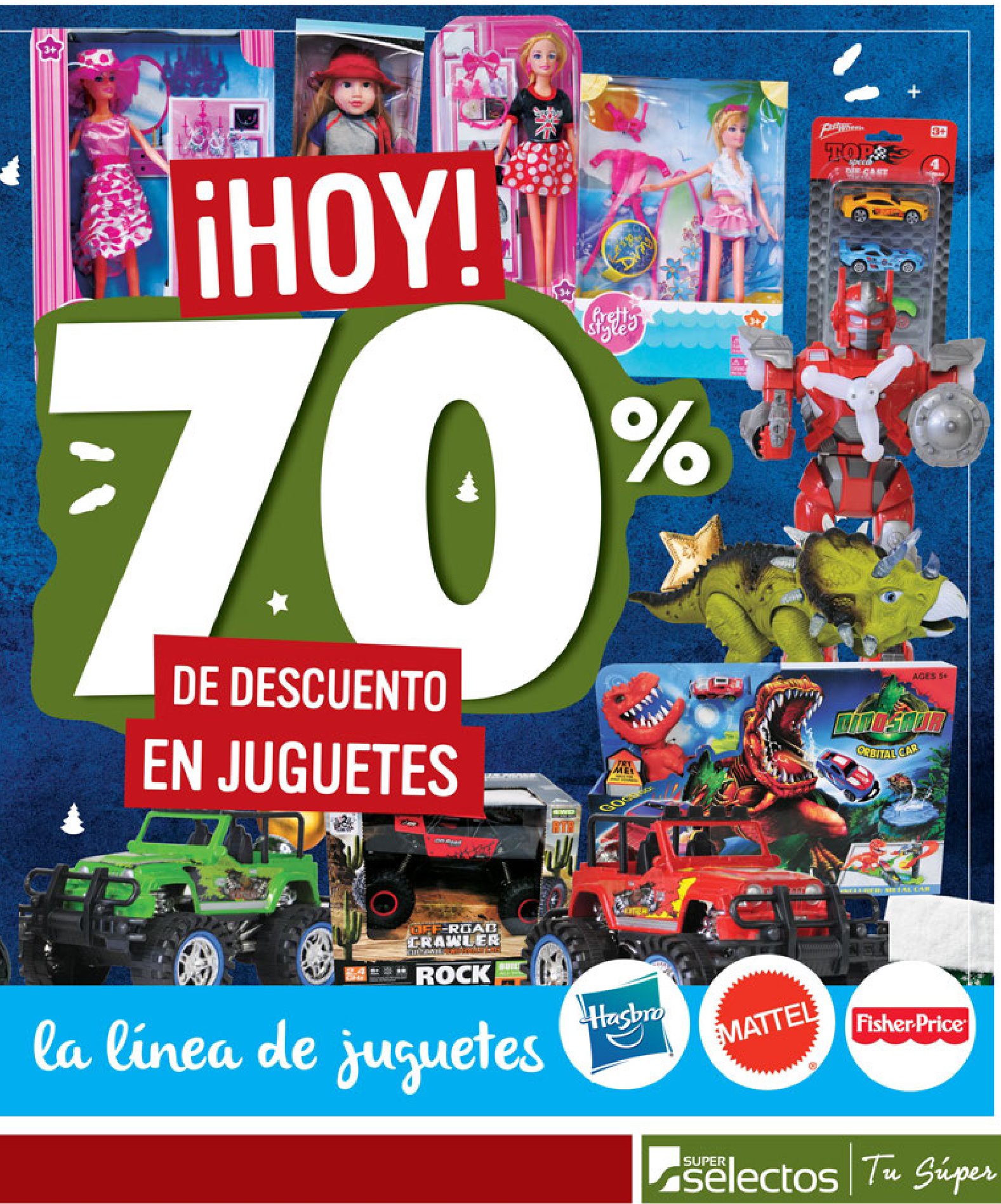 ¡Aprovecha hoy el 70% de descuento en muñecas, carritos, set de cocina, robots y muchos juguetes más solo en Súper Selectos! Válido 22 de diciembre de 2017. Máximo 10 unidades de cada oferta por cliente. Mientras duren las existencias. Restricciones aplican. Súper Selectos se reserva el derecho de limitar la cantidad de unidades a vender por cliente. Hasbro, Fisher Price y Mattel con el 25% de descuento.