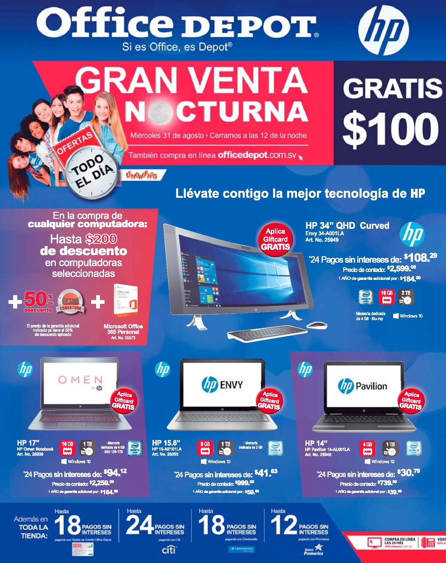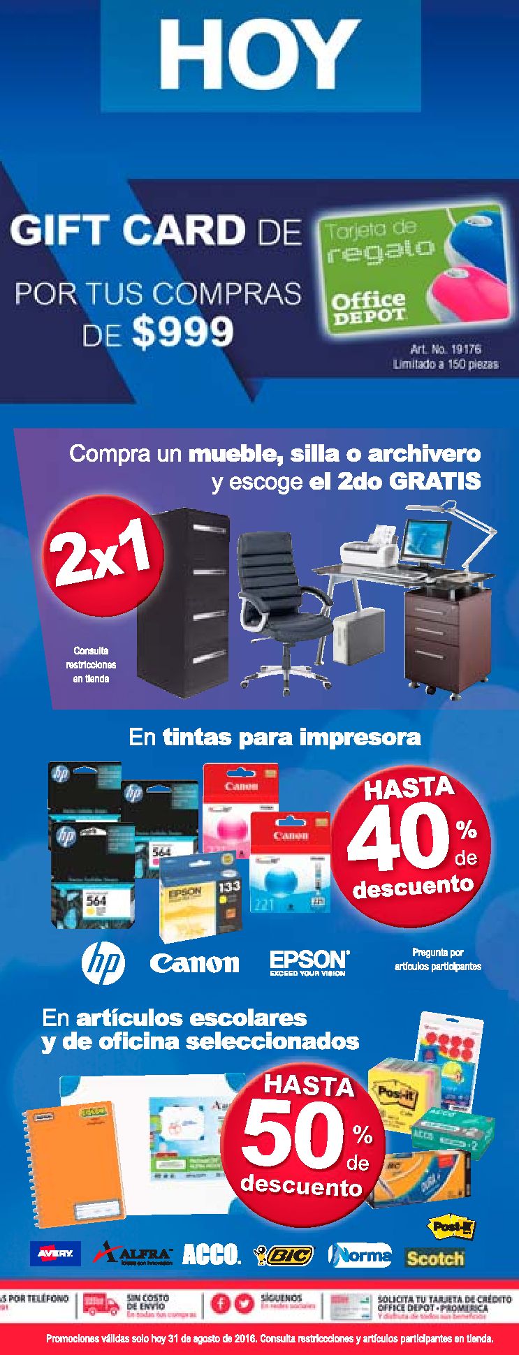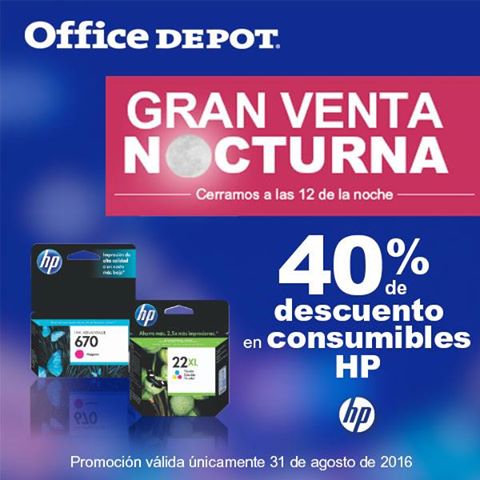¡Ya viene la Gran Venta Nocturna! No te pierdas las promociones y descuentos que tienen para ti. ¡SÓLO 31 DE AGOSTO! #SiEsOfficeEsDepot ¡Ya comenzó la Gran Venta Nocturna! Tenemos 40% de descuento en consumibles de la marca HP! ¡SÓLO HOY! Ahora GRAN venta nocturna en Office Depot (31-ago-16)