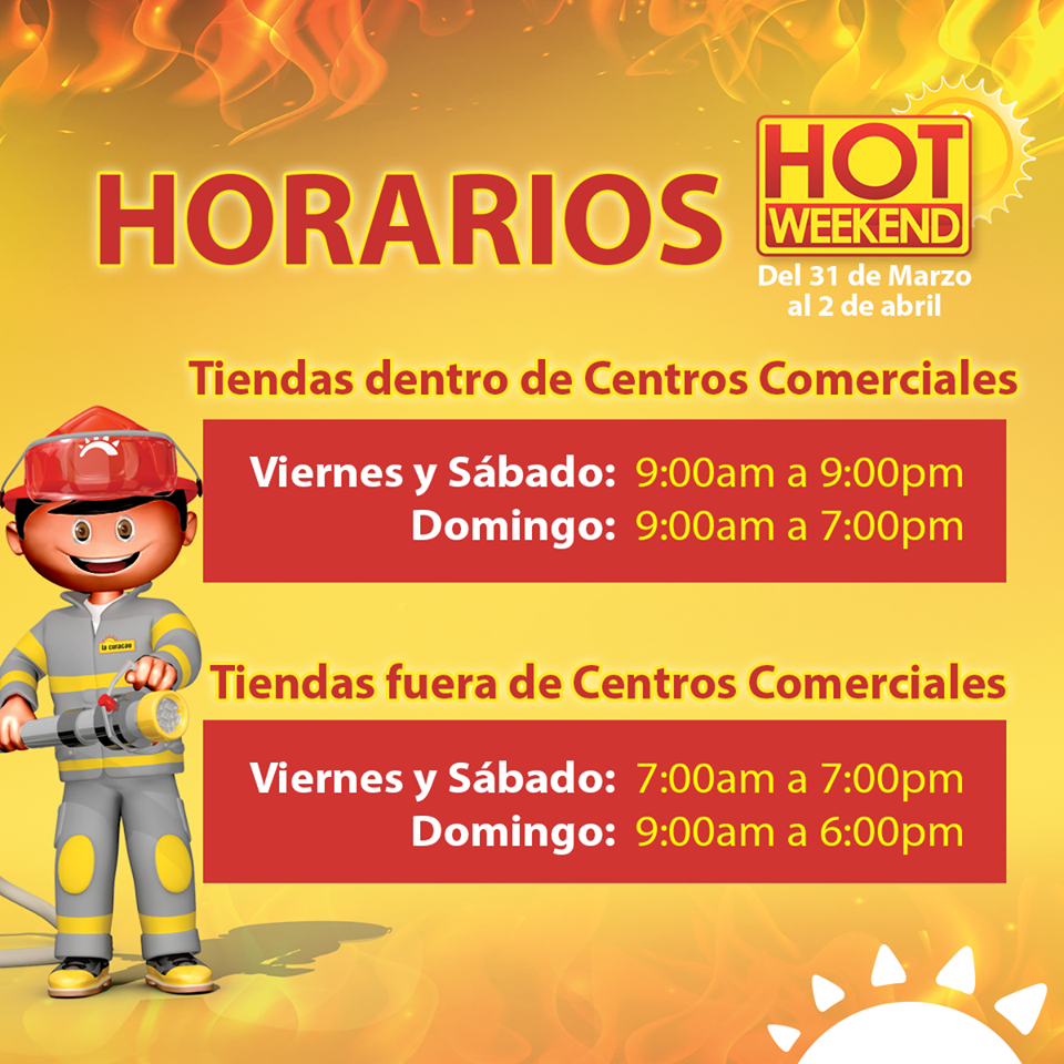 Acá te dejamos los horarios de nuestro HOT WEEKEND ???????? Aprovecha y compra pantallas, lavadoras, comedores, salas, smartphones y muchos productos con las OFERTAS más CALIENTES que nunca ???? Del 31 de marzo al 2 de abril, en TODAS nuestras sucursales ????????