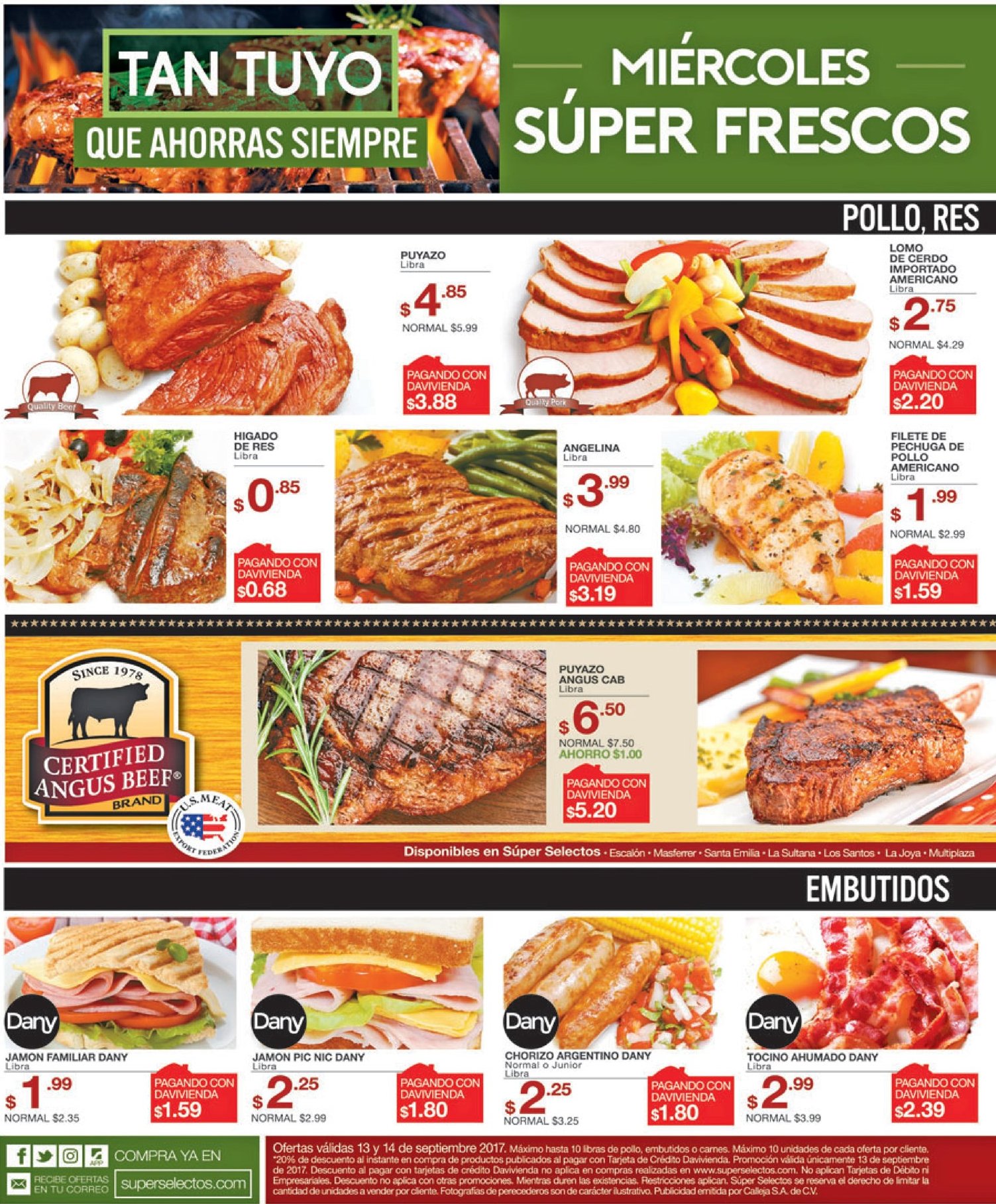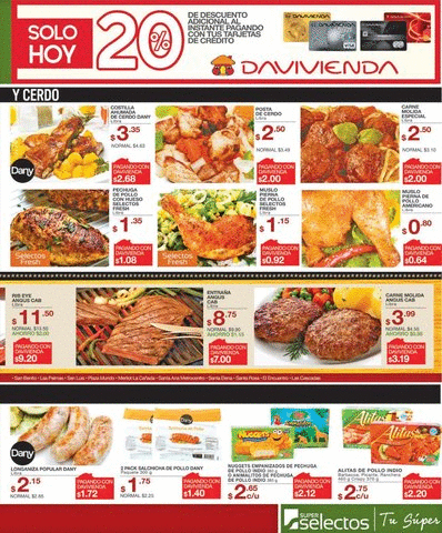 Términos y condiciones: *20% de descuento al instante en compra de productos publicados al pagar con Tarjeta de Crédito Davivienda. Promoción válida únicamente 13 de septiembre de 2017. Descuento al pagar con tarjetas de crédito Davivienda no aplica en compras realizadas en www. superselectos .com. Ofertas, sin precio Davivienda, válidas 13 y 14 de septiembre 2017. Máximo hasta 10 libras o 10 unidades de cada oferta por cliente. No aplican Tarjetas de Débito ni Empresariales. Descuento no aplica con otras promociones. Mientras duren las existencias. Restricciones aplican. Súper Selectos se reserva el derecho de limitar la cantidad de unidades a vender por cliente.