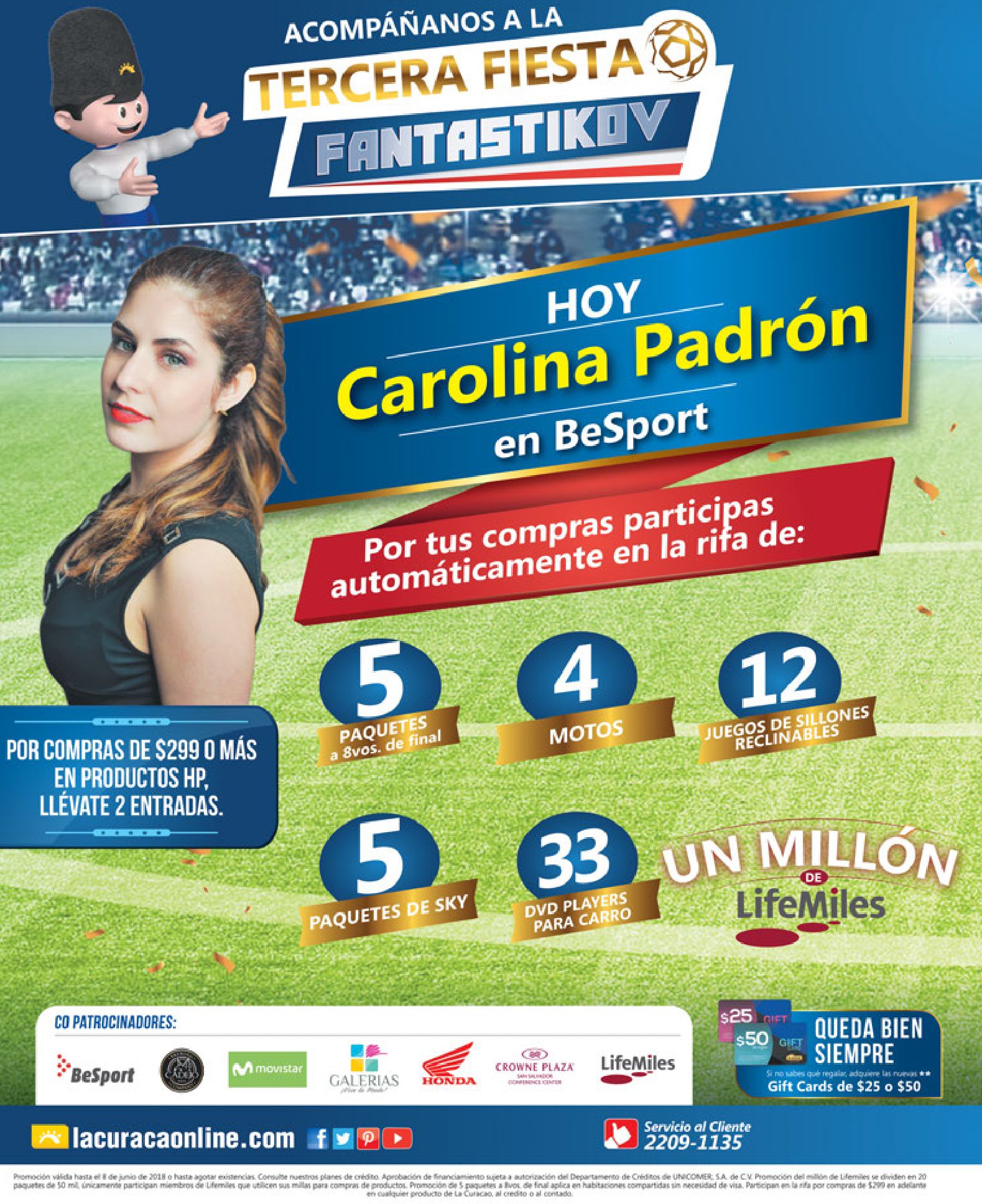 La tercera fiesta fanastikov de almacenes la curacao el salvador contara con la pracencua de Carolina Padron, presentadora de Sport Center de la prestigiosa cadena ESPN. Visita las susucursales de la curacao y mira como puedes participar. aperovecha estar super ofertas ademas.