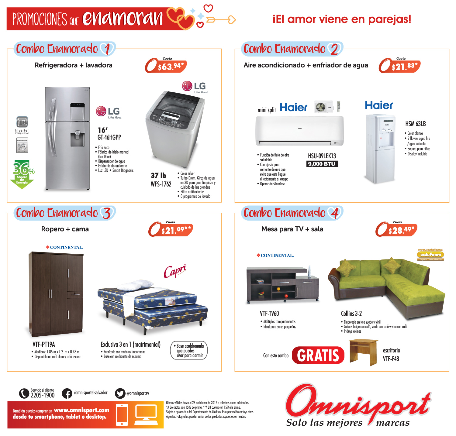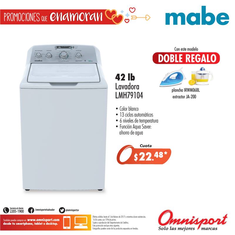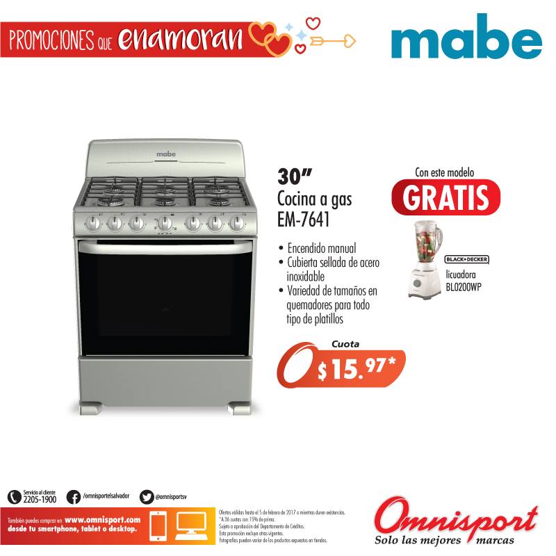 BATIDORA para regalar este mes de san valentin 2017 Cocina a gas de 20 pulgadas marca MABE febreor 2017 COCINA DE GAS de 6 ornillas lista para regalar COMBO porque el amor viene en pareja san valentin 2017 juego de comedor TUCSON en omnisport sv Juego de sala en colo chocolate para novios enamorados Lavadora de 40 libras GE appliance Lavadora de 42 libras marca MABE appliances MINI BAR mabe frigorifico para la oficina o estudio omnisport catalogo de ofertas para el 14 de febrero OMNISPORT En oferta la nueba laptop touch HAIER Plancha en oferta marca black and decker con diseno retro Promociones que enamoran de almacenes OMNISPORT el salvador teatro en casa marca SONY oferta en febrero 2017