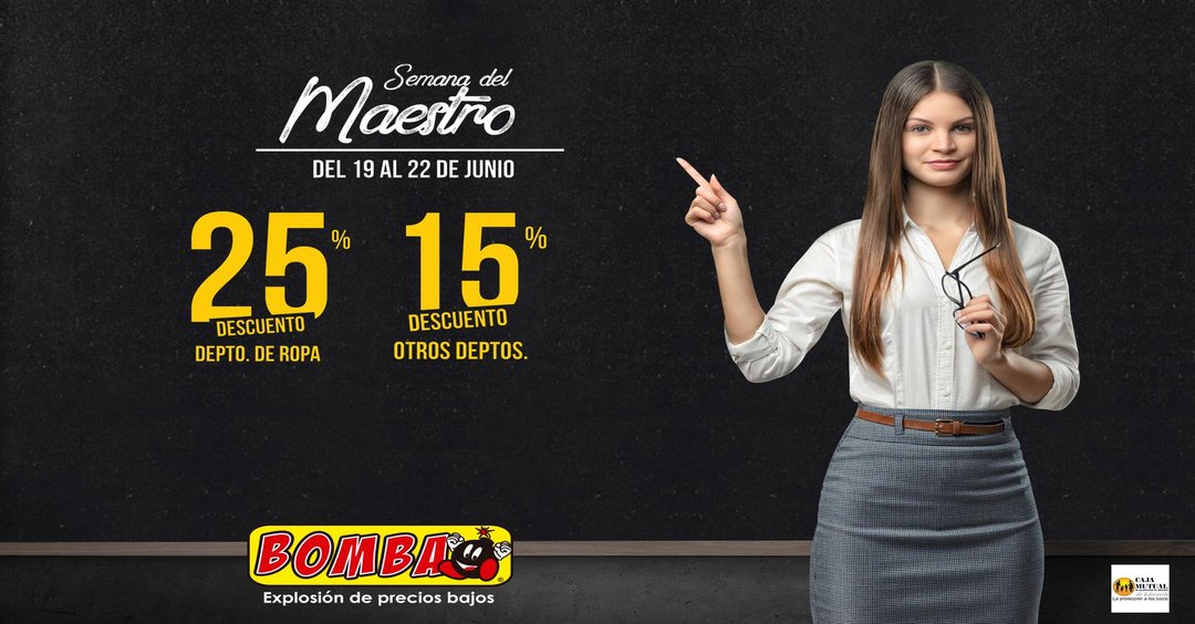 ¿Eres maestro? Aprovecha ésta súper promoción dedicada especialmente para ti. Solo debes presentar tu carnet en cualquier sucursal bomba. Promoción válida del 19 al 22 de junio. *Restricciones Aplican.