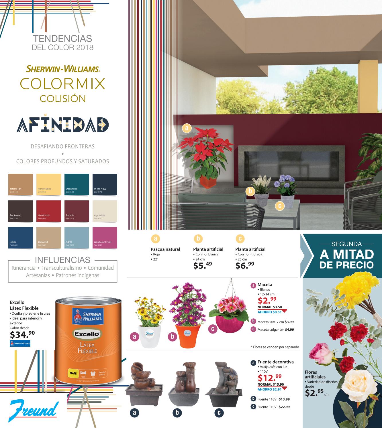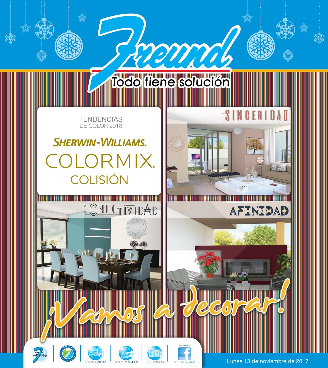 Ferreterias FREUND el salvador presenta su cuadernillo de ofertas dedicado a tus proyectos y necesidades de pintura, encuentra soluciones a tus ideas de colores con la nueva coleccion sherwin williams tendendencias 2017 color mix colision, afinidad, sinceridad, conectividad y afinidad.