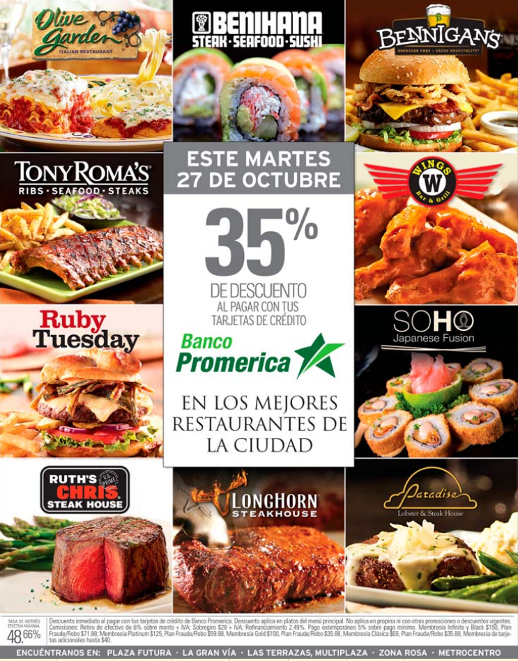 Este martes 27 de octubre 35 OFF en restaurante de lujo gracias a BANCO PROMERICA. Combos y Descuentos fabulosos en resturantes (27-oct-15). ultima semana con 30 off en restaurantes gracias a SCOTIBANK. TONY ROMAS, RUBY TUESDAT, BENNIGANS, BENIHANA, etc.