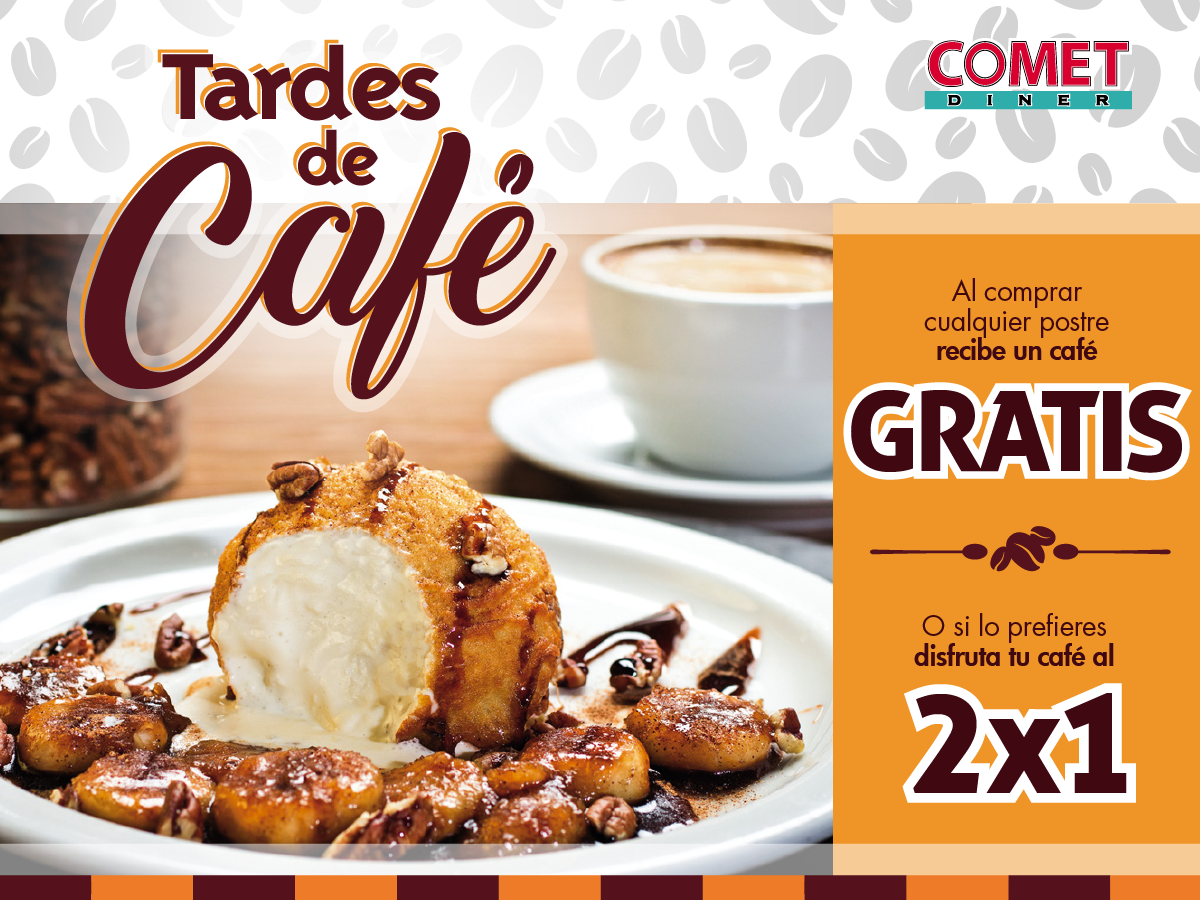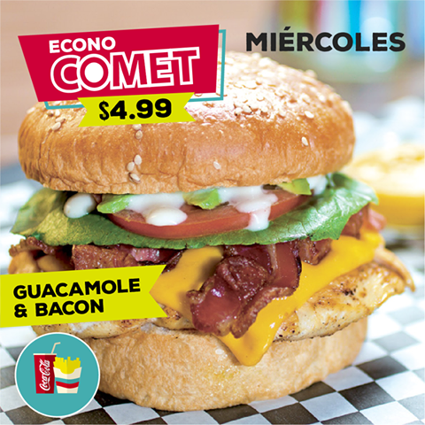 ¿Un café para la tarde? Al pedir tu postre favorito te regalamos el café o si lo prefieres disfrútalo al 2×1. Restricciones: -Válido de lunes a viernes de 3 p.m. a 6 p.m. -Una promoción por mesa. En #CometDiner siempre tienes una deliciosa opción para disfrutar. Este día pide la Guacamole Bacon Burger en combo a $4.99. Restricciones: -Válido de lunes a viernes de 11 a.m. a 3 p.m. -No aplica con otras promociones.