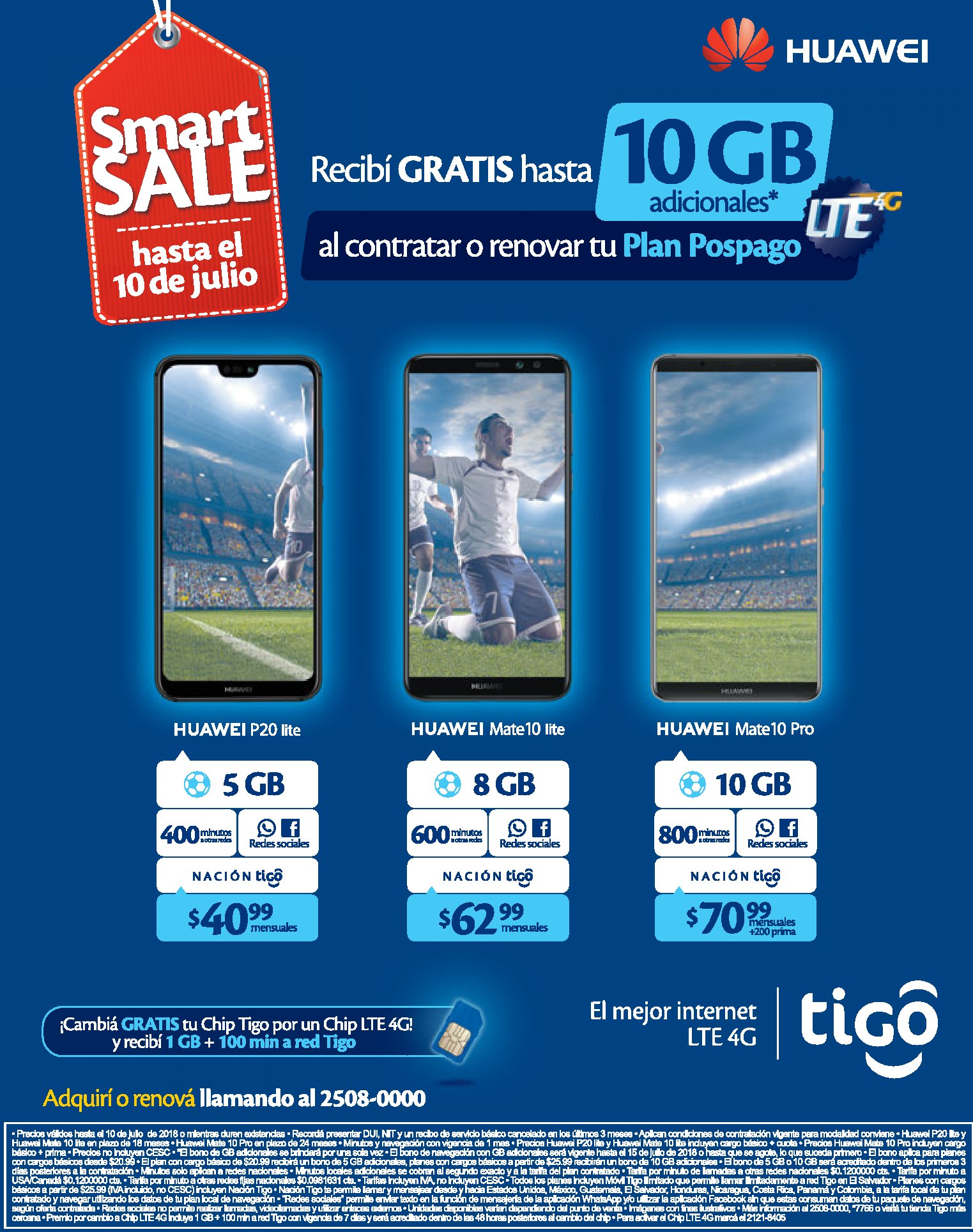 Si contratas o renovas tu plan pospago TIGO el salvador podes automaticamente acceder a este beneficio. SMART SALE de tigo es una promcoion validas hasta 10 de julio de 2018. HUAWEI P20 lite, HUAWEI Mate 10 lite, HUAWEI mate 10 Pro. MINUTOS , redes sociales, NACION tigo, que esperas renova tu plan.