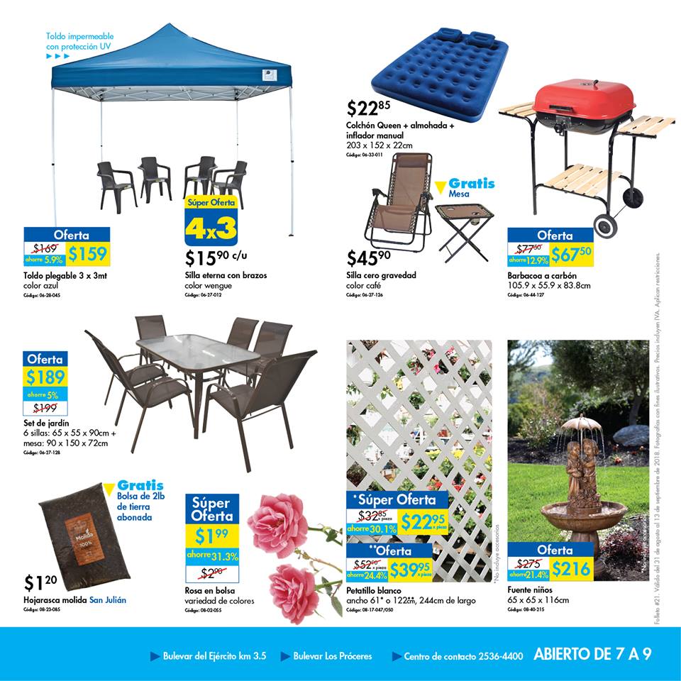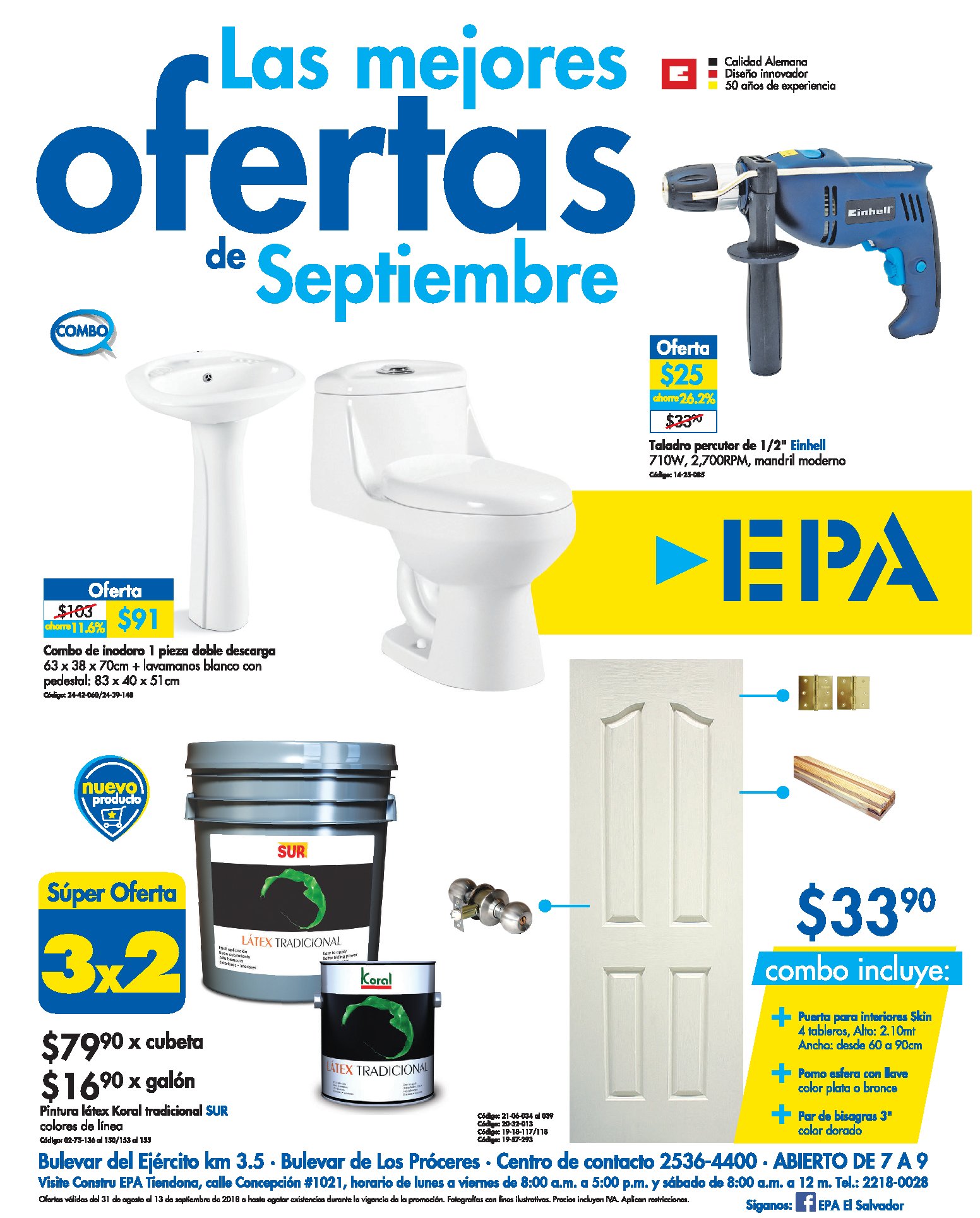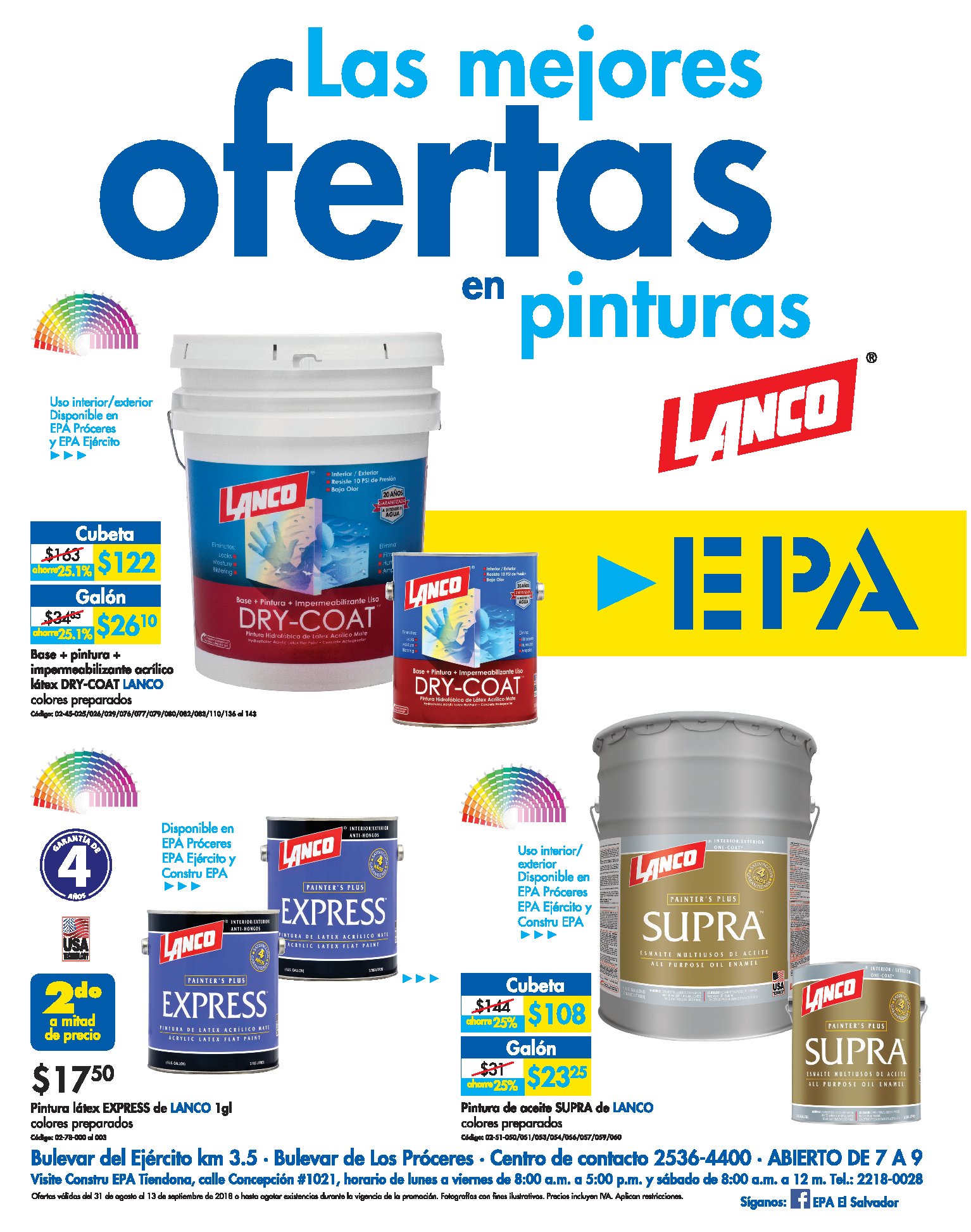 EPA El Salvador quiere que recibamos el mes de septiembre 2018 con las mejores ofertas! Acérquese y llévese todo lo que necesita en nuestras sucursales de Los Próceres y en Bulevar del Ejército, en horario de 7 a.m. a 9 p.m. Vea las ofertas ingresando aqui Ofertas válidas hasta el 13 de septiembre.