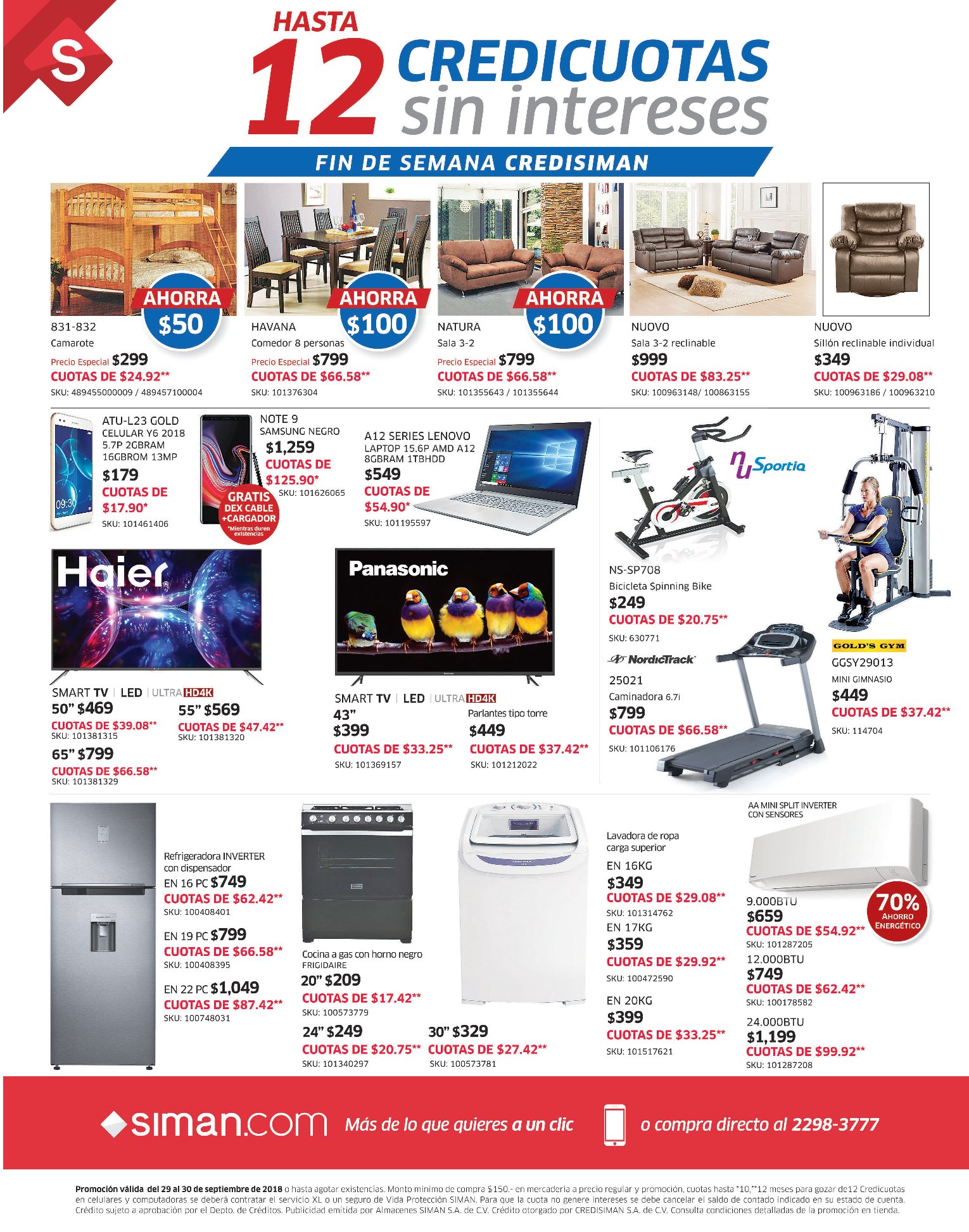 Promoción válida 29 y 30 de septiembre 2018. **Para gozar de 12 Credicuotas en celulares y computadoras se debe contratar el Servicio de Reparación XL o Seguro de Vida Protección SIMAN. Monto mínimo a financiar desde $150. ***Cliente debe optar por descuento o 6 Credicuotas sin intereses, el descuento no aplica en Chanel, Dior, Dolce&Gabbana. Consulta marcas participantes en tiendas. Ver condiciones en tienda. Promociones exclusivas para tarjetahabientes Credisiman.