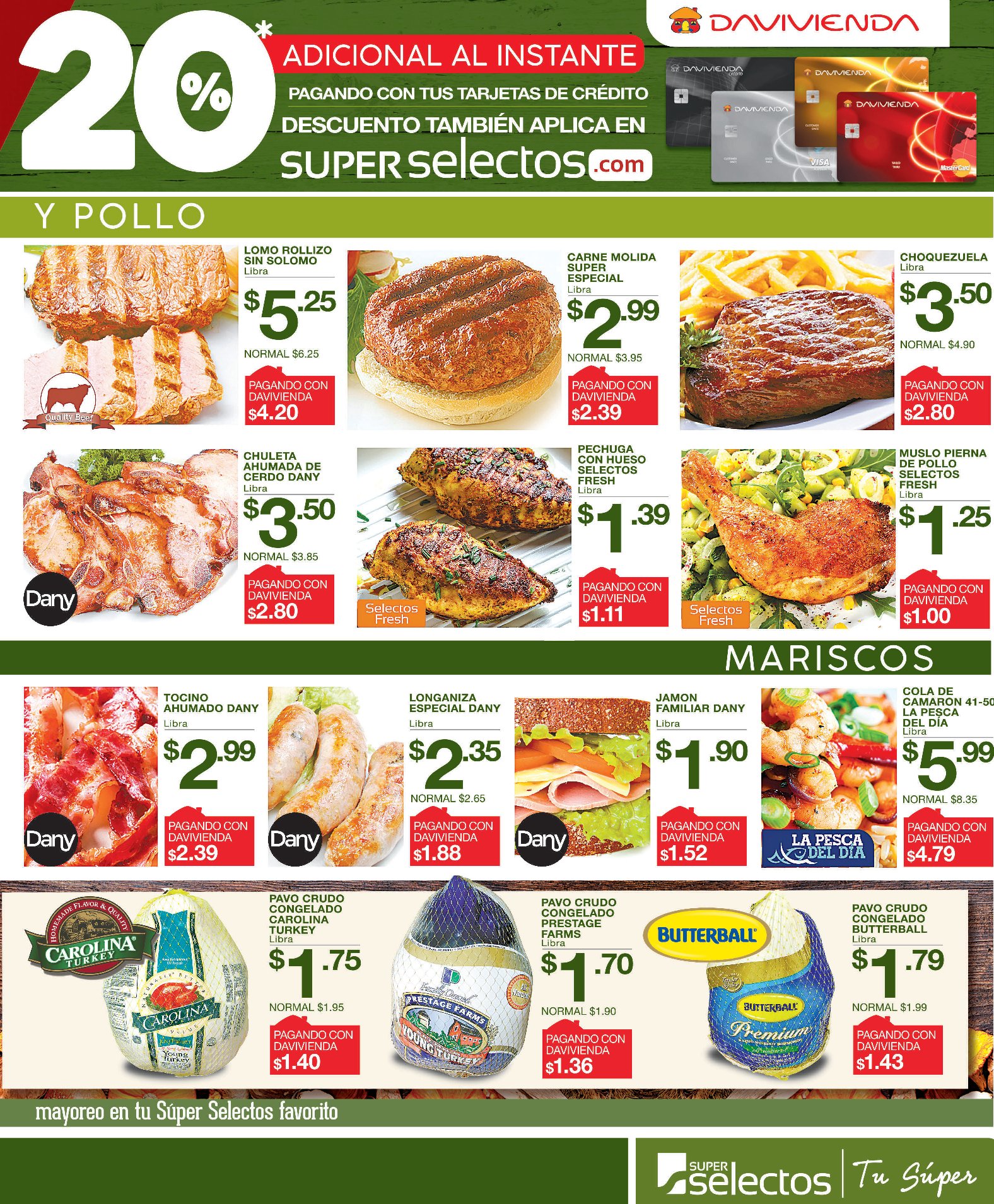 Ofertas válidas 20 y 21 de noviembre de 2019. Máximo hasta 10 libras de carne de res por cliente. Máximo hasta 10 unidades de pavo por cliente.*20% de descuento al instante en compra de productos publicados al pagar con Tarjeta de Crédito Davivienda. Promoción válida únicamente 20 de noviembre de 2019. No aplican Tarjetas de Débito ni Empresariales. Descuento no aplica con otras promociones. Mientras duren las existencias. Restricciones aplican. Súper Selectos se reserva el derecho de limitar la cantidad de unidades a vender por cliente. Fotografías de perecederos son de carácter ilustrativo.