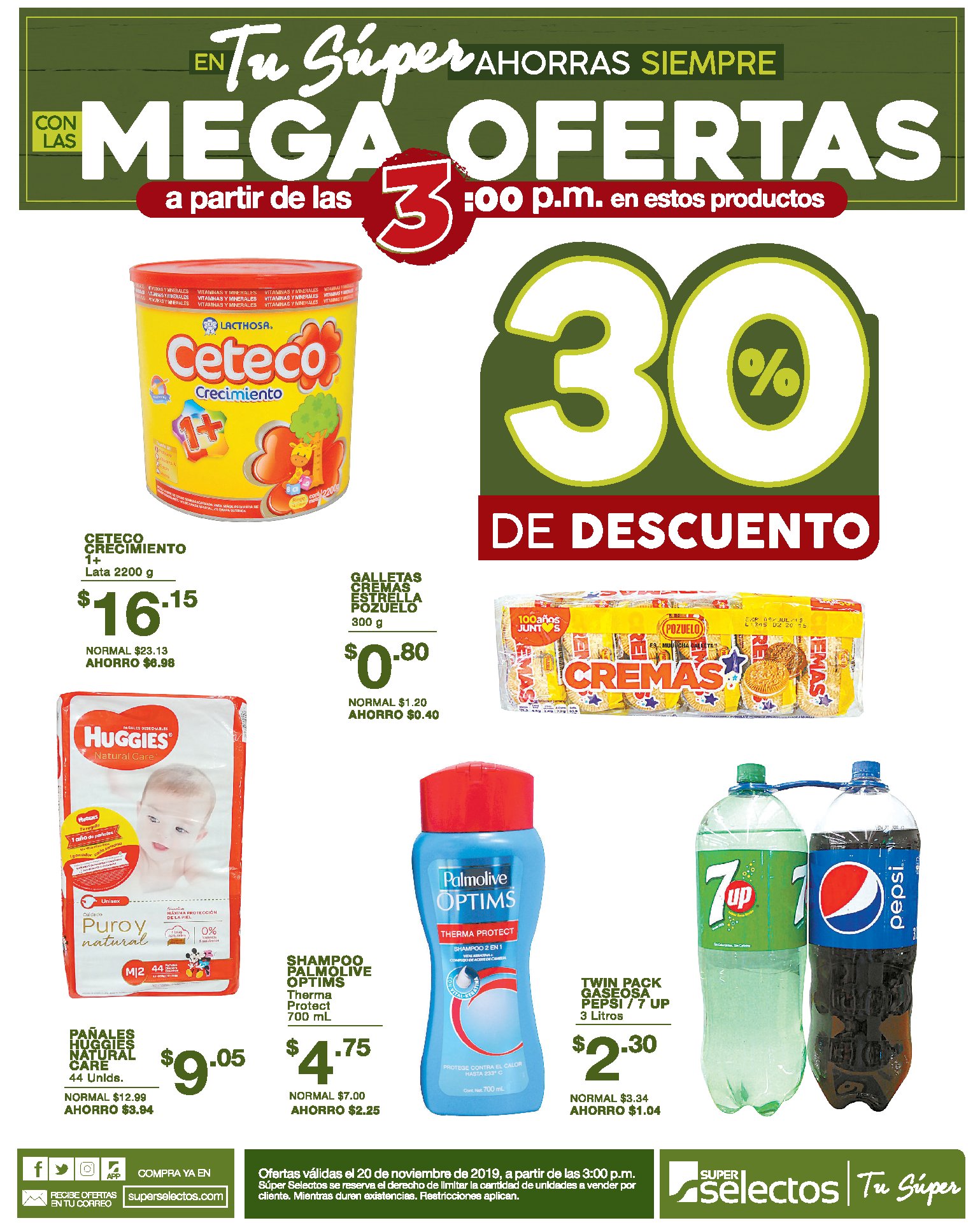 Aprovecha estas #MegaOfertas en todos los Súper Selectos desde las 3:00 p.mOfertas válidas el 20 de noviembre negro black friday de 2019, a partir de las 3:00 p.m. Súper Selectos se reserva el derecho de limitar la cantidad de unidades a vender por cliente. Mientras duren existencias. Restricciones aplican.