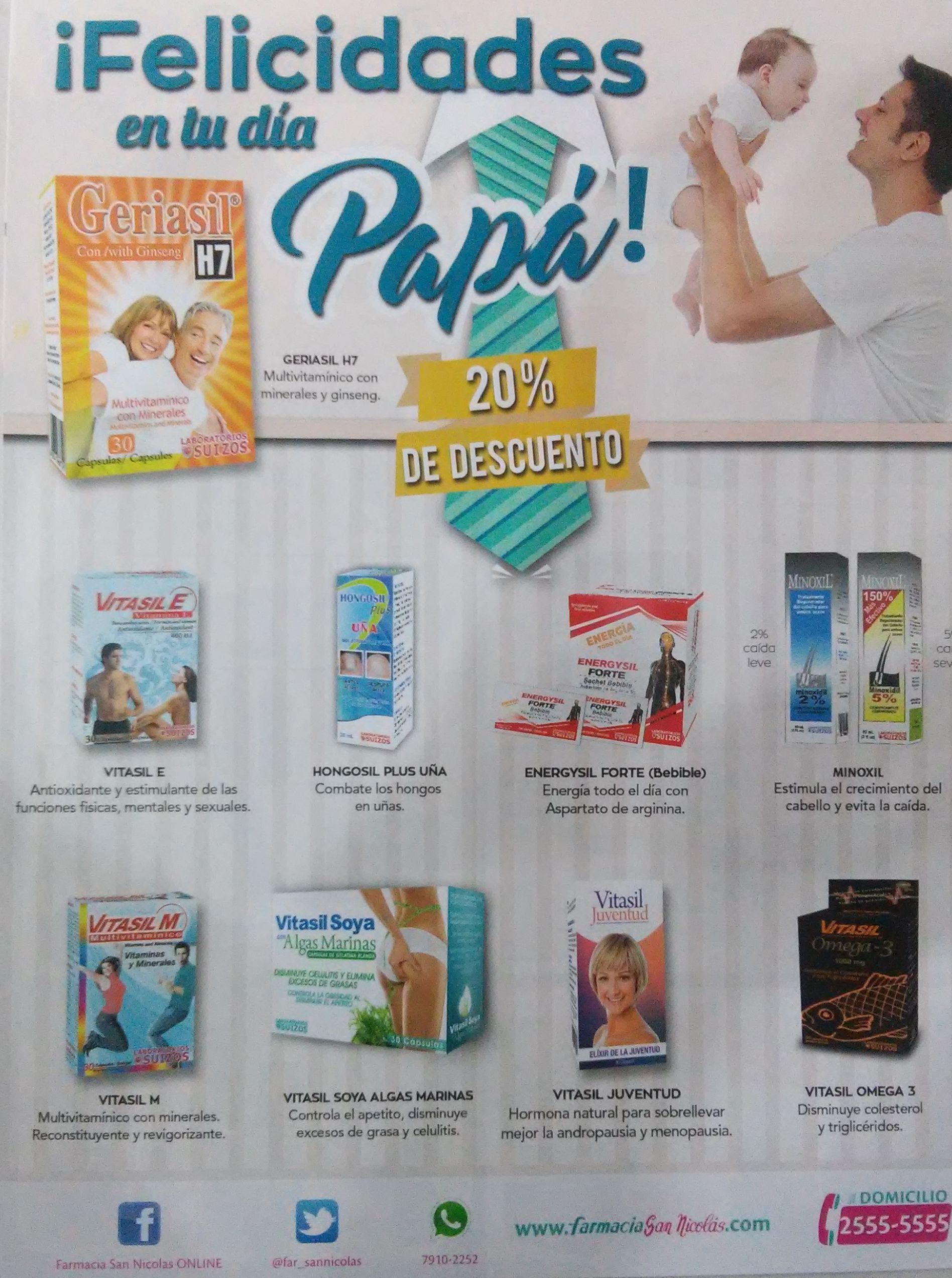 Farmacias San Nicolas el salvador presenta su catalogo de ofertas y descuentos para PAPA. Porque Papá también merece regalos, dedicamos ofertas especialmente para ellos. Tenemos las vitaminas que necesitas para mantenerte saludable #SabemosLoQueNecesitas. En Farmacia San Nicolás nuestros doctores te atienden sin hacer fila y en las condiciones ideales para tu comodidad. Recuerda que por tus compras de $5 o mas en productos de conveniencia te llevas un ejemplar del Diario de Hoy GRATIS. Productos de necesidad en nuestros hogares este mes los encuentras con descuentos especiales. #SabemosLoQueNecesitas