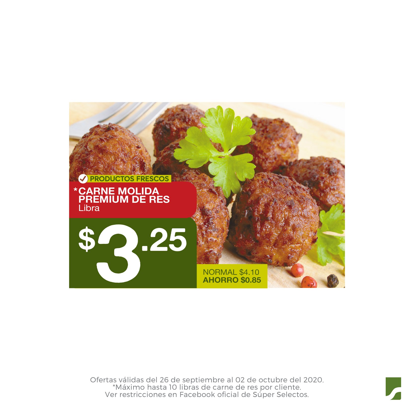 Todo lo que necesitas con #MásAhorro por 7 días en #TuSúper favorito.Ofertas válidas del 26 de septiembre al 2 de octubre de 2020. *Máximo hasta 10 libras de carne de res por cliente. **No aplica en superselectos.com y Súper Selectos App. Mientras duren existencias. Restricciones aplican. Súper Selectos se reserva el derecho de limitar la cantidad de unidades a vender por cliente.Fotografía de perecederos son de carácter ilustrativo.