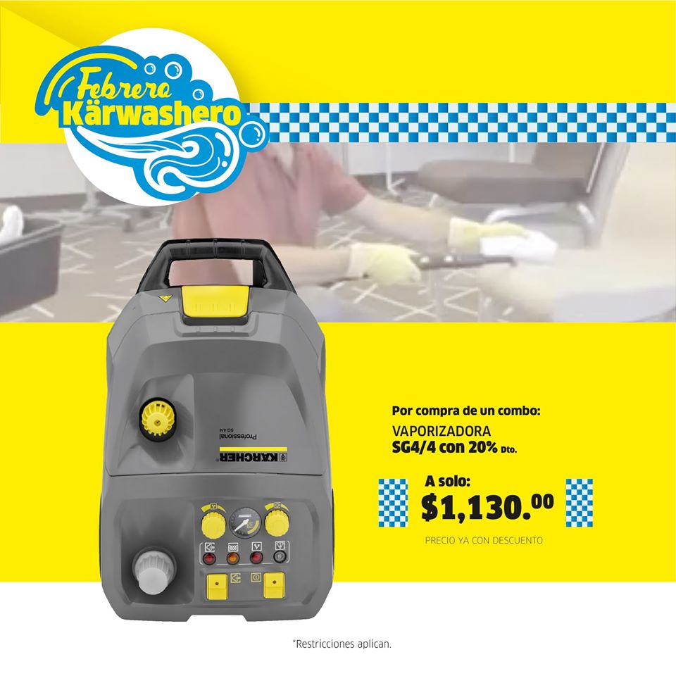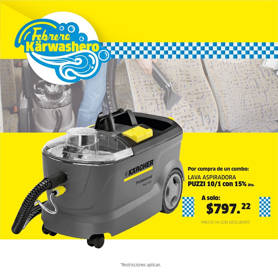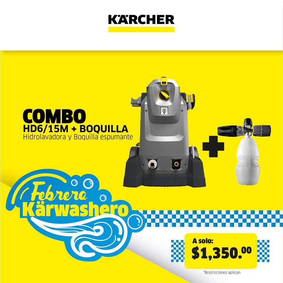 COMBO 2:😎😎 Hidrolavadora HD6/15M (2,175 PSI), para el lavado de 40 vehículos por día + Boquilla espumadora. A solo $1,350.00Y por compra de tu COMBO, puedes agregar* : 🔷Una Puzzi 10/1 por solo $797.22 🔷O una SG4/4 para limpieza a vapor, por solo $1,130.00*Restricciones aplican, válido hasta el 29 de febrero de 2020 y aplica únicamente para pago en efectivo en sucursal Kärcher Center.