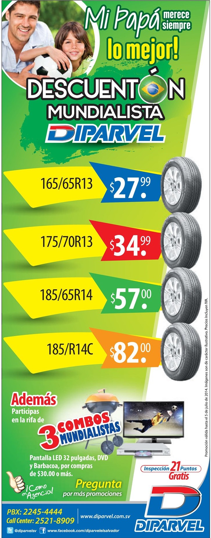 * Gana combos mundualista DIPARVEL promociones – 09jun14 (tires Ofreciendo una excelente maniobrabilidad en pavimento seco y mojado, su banda de rodamiento de diseño unidireccional aumenta el área de contacto con el piso para un mayor control en situaciones extremas como maniobras, frenadas y aceleraciones bruscas. ¡Encuéntrala en nuestros centros de servicio! )