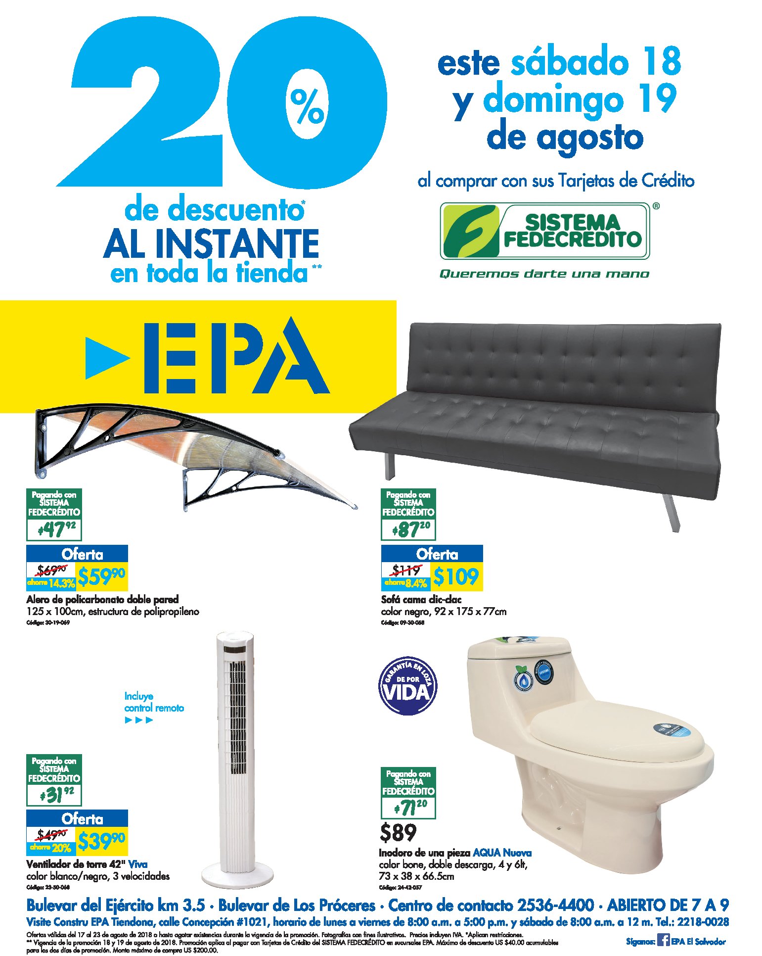Este fin de semana puede venir a EPA y encontrar eso que anda buscando para su hogar, porque lo tenemos y al mejor precio. Y con un 20% de descuento* al instante con sus tarjetas de créditos de SISTEMA FEDECRÉDITO. Ofertas válidas hasta el 23 de septiembre de 2018. *Promoción válida 18 y 19 de agosto de 2018.