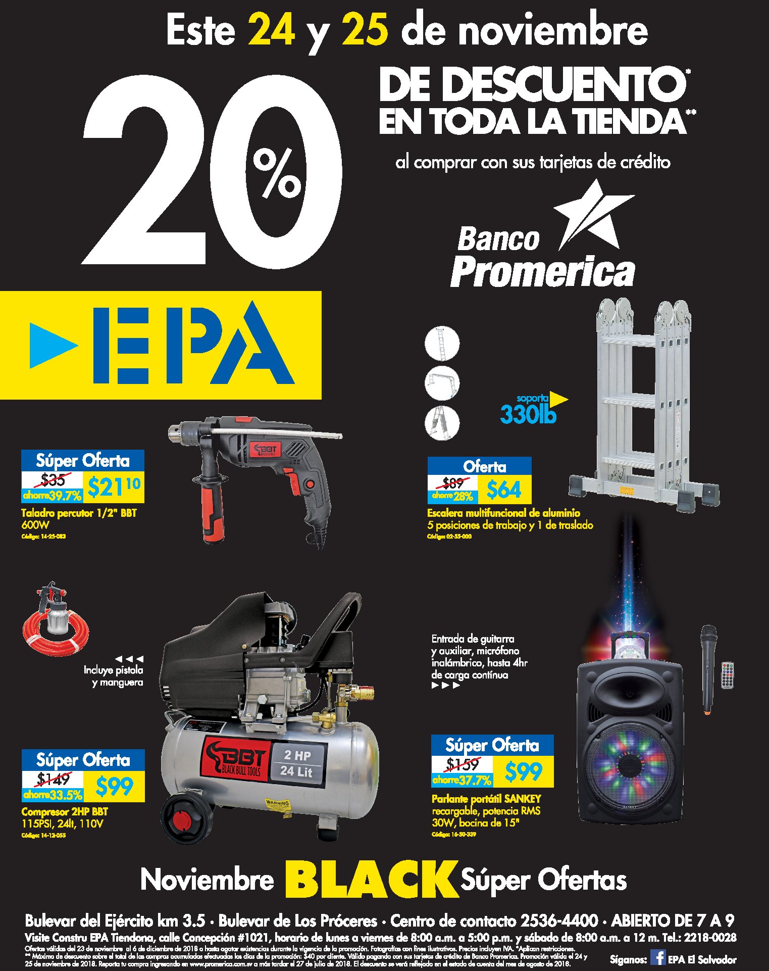 Compre este fin de semana en EPA y reciba un 20% de descuento al pagar con tarjetas de crédito de Banco Promérica. Promoción válida únicamente el 24 y 25 de noviembre de 2018 o hasta agotar existencias. Restricciones aplican.