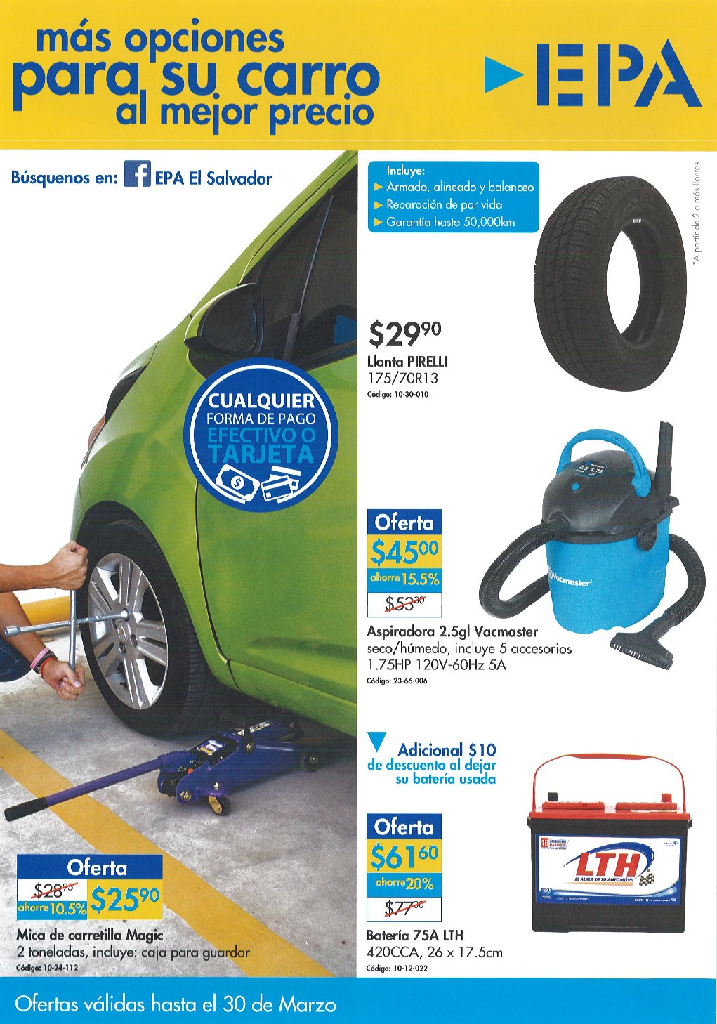 Accesorios para mantener limpio tu vehiculo disponibles en EPA el salvador. Accesorios que todo automovil debe tener en su baul. Auto limpios con estas ofertas ferreteria epa marzo 2017. Descuentos Ferreteria EPA bateria para carros LTH y RAYO. Ferreteria EPA accesorios para vehiculos alfombras forris timon estribos. Ferreteria EPA Catalogo especial de ofertas para tu auto. Ferreteria EPA descuentos en aceites y aditivos AKRON. Ferreteria EPA ofertas en llantas ara tu vehiculo en marzo 2017. Ferreteria EPA ofertas para su carro – marzo 2017. PROMOCIONES VALIDAS HASTA EL 30 DE MARZO DE 2017