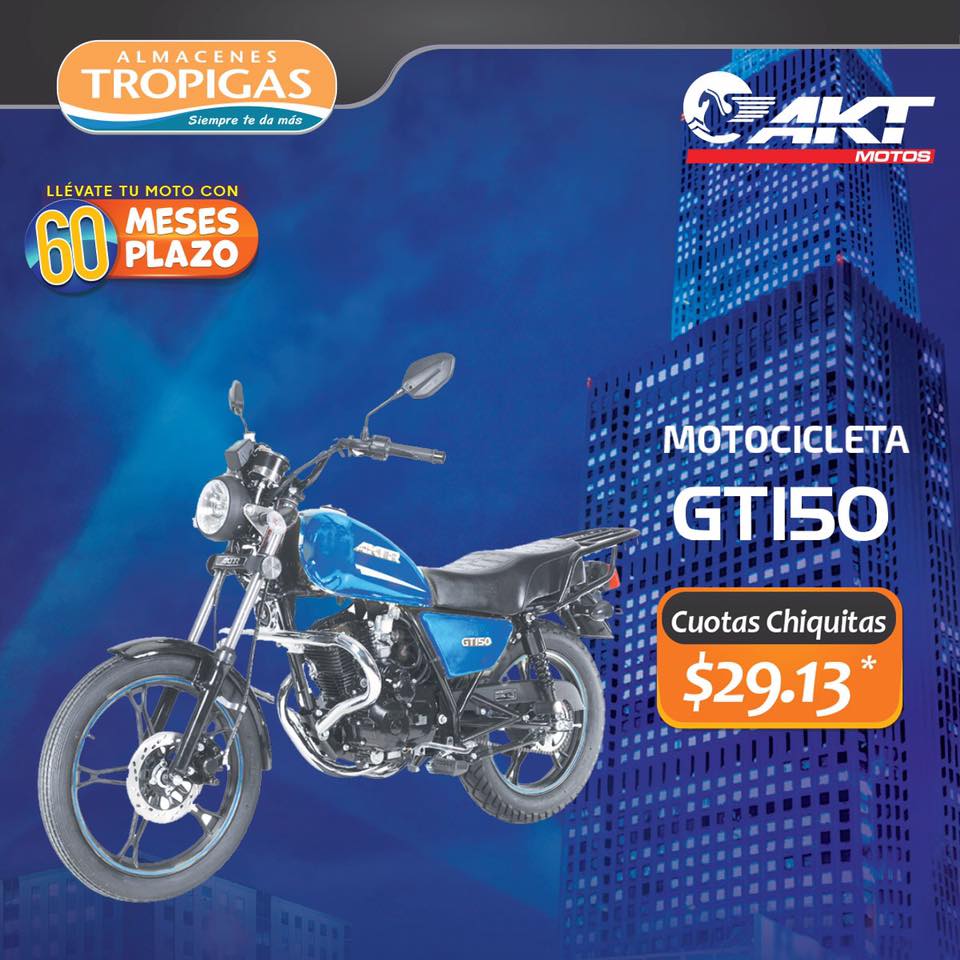 Las ofertas mas gigantes las encuentran en #AlmacenesTropigas, aprovecha el evento mas grande del año y llévate tu moto nueva AKT hasta con un 50% de descuento. No dejes pasar las cuotas chiquitas y precios bajitos.*Restricciones aplican, mayor información en sucursales. *Promoción válida del 15 de noviembre al 1 de diciembre de 2019.