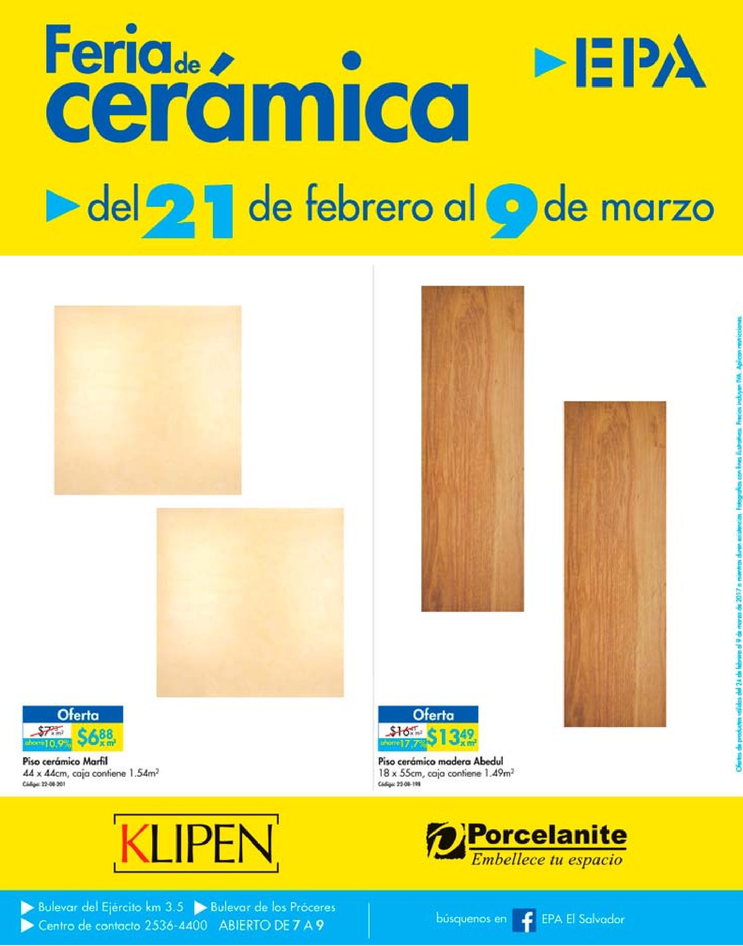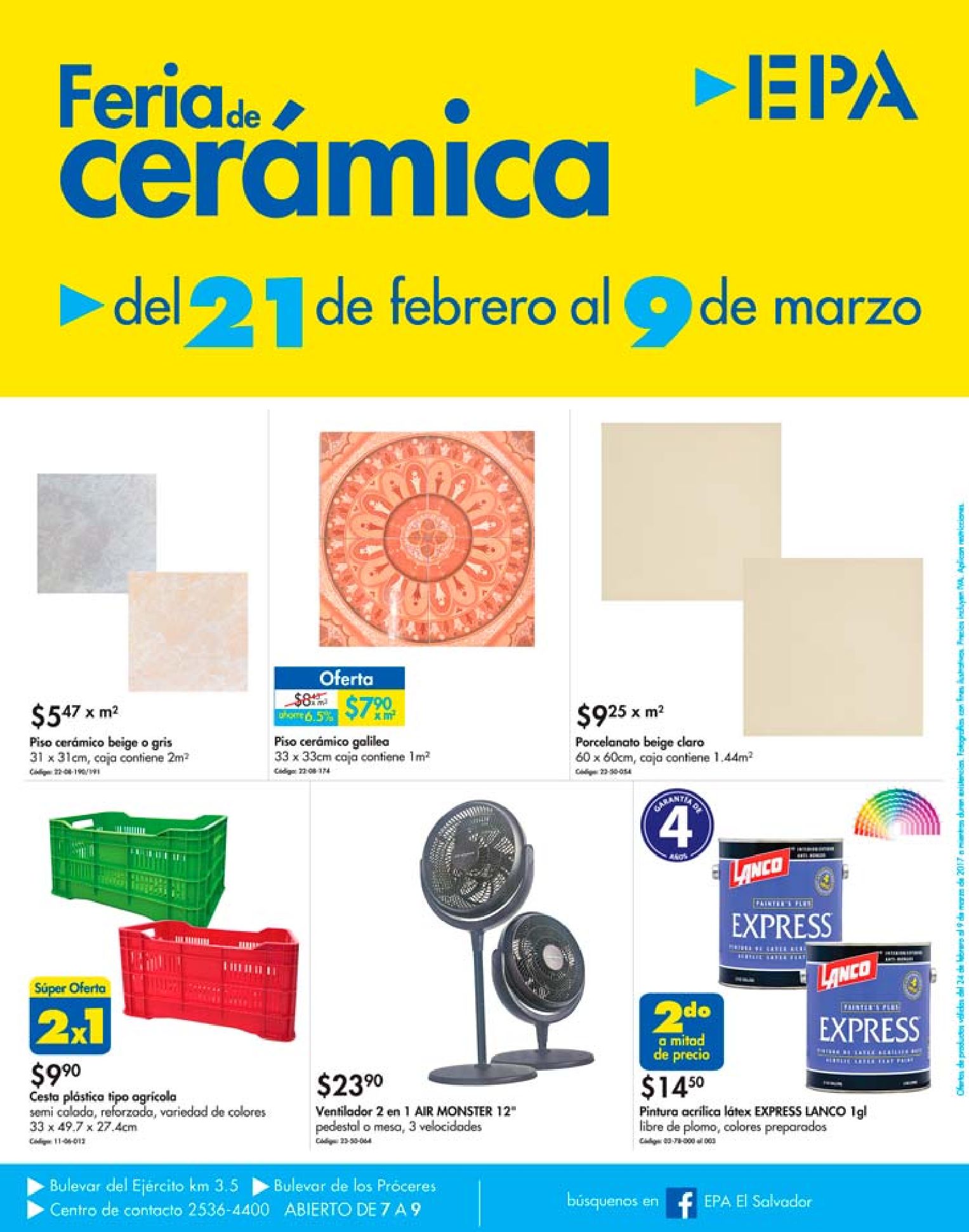 Llego el folleto de la feria de ceramica el salvador en tu ferreteria EPA SV, promociones validas hasta el 09 de marzo de 2017. Consejos para escoger el mejor productos para remodelar o decorar tu casa, pegamentos de primer nivel y todos los accesorios para los profesional en instalacion de pisos ceramicos, no te quedes sin consulta la nueva Guia ESPECIAL de pisos CERAMICOS en Ferreteria EPA