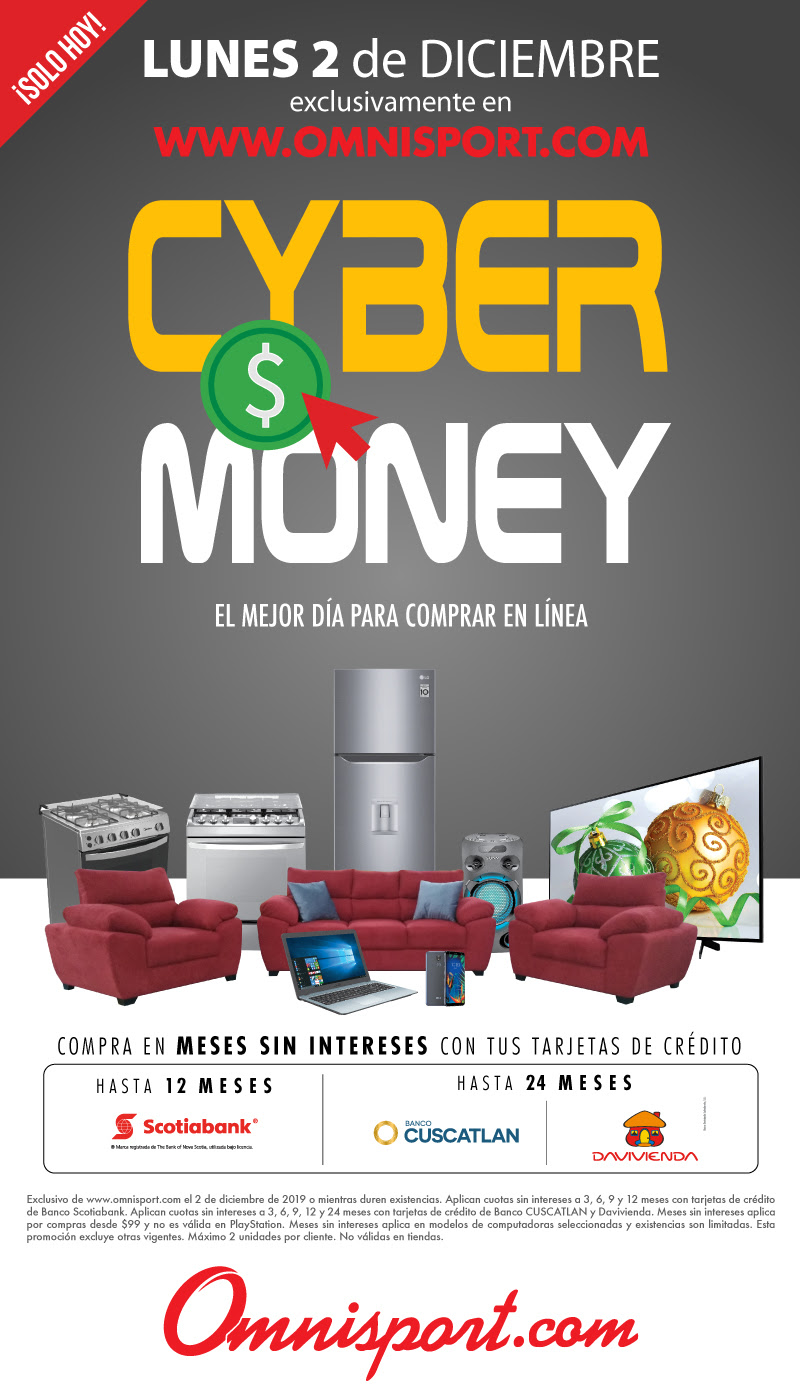 Exclusivo de www.omnisport.com el 2 de diciembre de 2019 o mientras duren existencias. Aplican cuotas sin intereses a 3, 6, 9 y 12 meses con tarjetas de crédito de Banco Scotiabank. Aplican cuotas sin intereses a 3, 6, 9, 12 y 24 meses con tarjetas de crédito de Banco CUSCATLAN y Davivienda. Meses sin intereses aplica por compras desde $99 y no es válida en PlayStation. Meses sin intereses aplica en modelos de computadoras seleccionadas y existencias son limitadas. Esta promoción excluye otras vigentes. No válidas en tiendas. Máximo 2 productos de cada modelo por cliente.