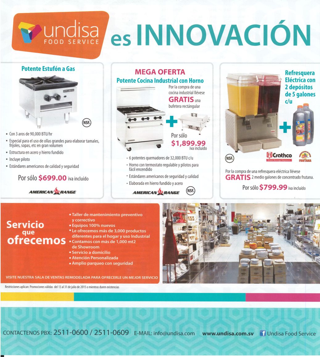 «Auto PITS promociones y ofertas en llanta KUMHO TIRES – 13jul15» «UNSISA distribuidores de equipos de cocina y accesorios para restaurantes» «Prefessional kitchen AID supply american standars» «TRAMONTINA juegos de cubiertos bateria de cocina» «Mega OFERTON cocina insustrial con horno maquina electrica de REFRESCOS» «Instalacion de ventiladores para epocas de calor» «Security cameras CCTV kit recorded DVR» «Modelos en promocion MOTOS SKYGO el salvador» «DEPARVEL te ayuda a tener listo tu auto para vacaciones» «Promociones linea de scanners AUTEL kit maxisys PRO» «Alambre Razor seguridad perimetral FREUND ferretertia – 13jul15» «HUAWEI mate 7 smartphone TIGO» «Paquetes vacacionales aereos los mejores destinos de america latina» «Reduce de peso medidas y luce mas joven con un cuerpo escultural»