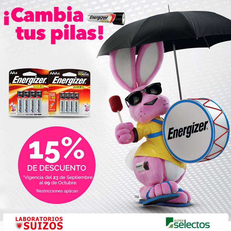 Aprovecha el 15% de descuento en estos productos #Energizer en Súper Selectos y superselectos .com Ofertas válidas del 23 de septiembre al 09 de octubre de 2017. Máximo 10 unidades por cliente. Mientras duren las existencias. Restricciones aplican.