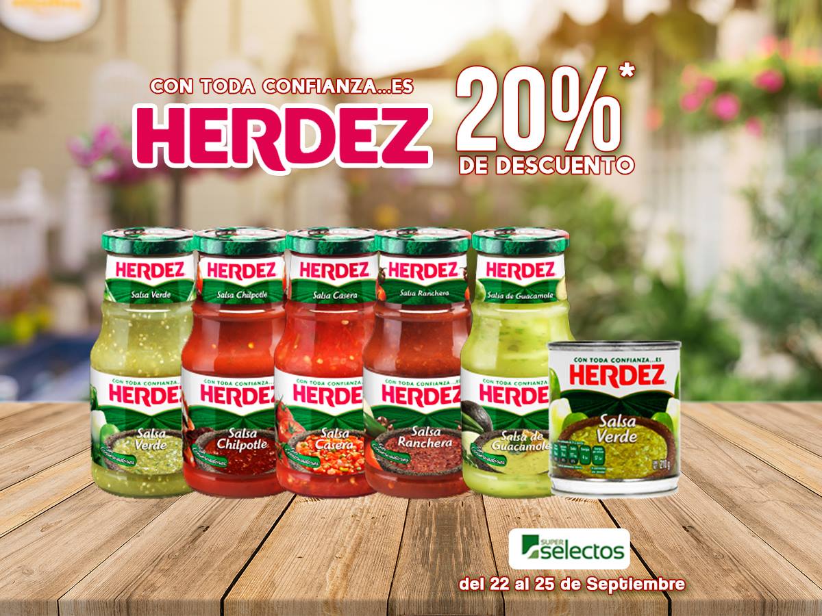 Aprovecha el 20% de descuento en estos productos #Herdez en Súper Selectos y superselectos .com Ofertas válidas del 22 al 25 de septiembre de 2017. Máximo 10 unidades por cliente. Mientras duren las existencias. Restricciones aplican. Salsa verde Herdez 453 g Salsa chipotle Herdez 453 g Salsa casera Herdez 453 g Salsa ranchera Herdez 453 g