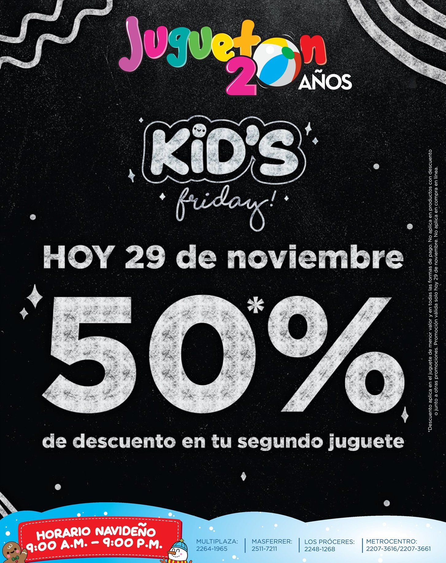 Este viernes 29 de noviembre adquiere tu SEGUNDO juguete con el 50% de DESCUENTO en TODAS las formas de pago ¡Aprovecha al máximo en la Sede Oficial de la Navidad! #JugarTeHaceCrecerSiempre #Juguetón20años*Válido únicamente este 29 de noviembre 2019. *Descuento aplica en el juguete de menor valor. *Válido en todas las formas de pago. *No aplica en juguetes con descuento o junto a otras promociones. *Consulta más restricciones en tienda.