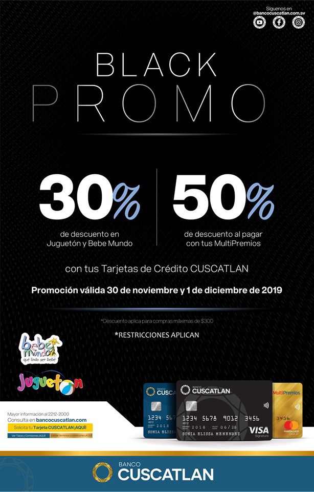 Este 30 de noviembre y 01 de diciembre obtén el 30% de descuento al INSTANTE en tus compras al pagar con tus tarjetas de crédito del banco Cuscatlán y el 50% DE DESCUENTO al pagar con tu Millas MultiPremios en Juguetón y Bebemundo 🎉 Te esperamos 😎*Válido únicamente 30 de noviembre y 01 de diciembre 2019. *Válido en producto a precio regular y no aplica junto con otras promociones y descuentos. *El descuento se aplica de inmediato en caja con un monto máximo de compra de $300.00 *No aplica para compra en línea. *Consulta otras restricciones en tienda.