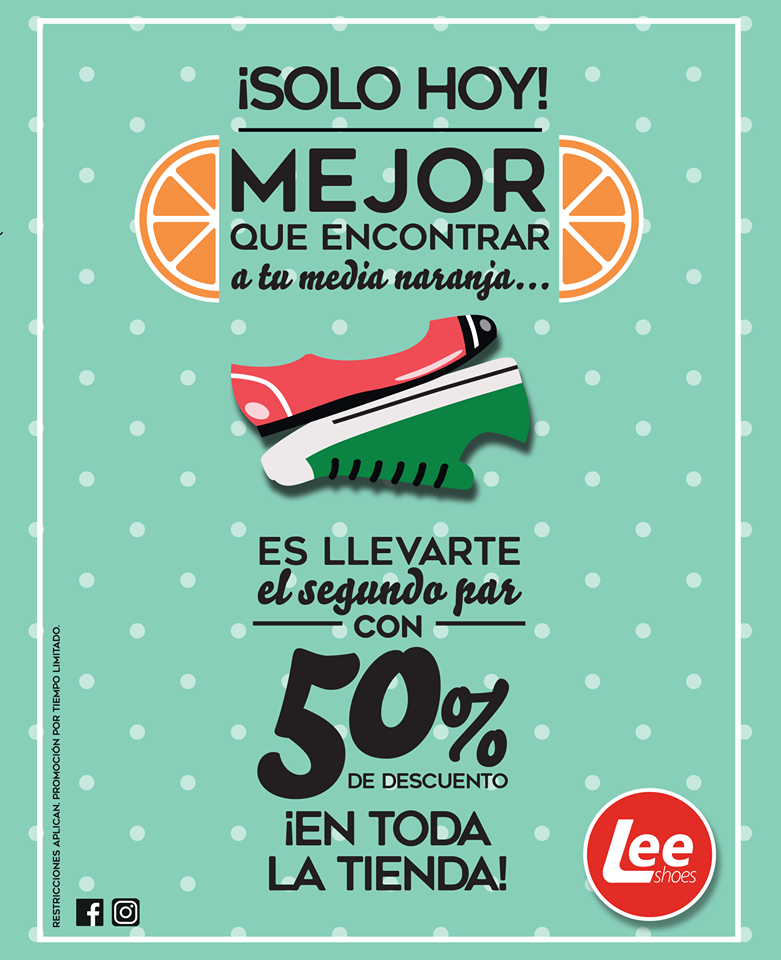 Visita tu zapateria Lee Shoes favorita y lleva el segundo par con 50% de descuento. Promoción valida del 27 al 30 de noviembre de 2017. Restricciones Aplican