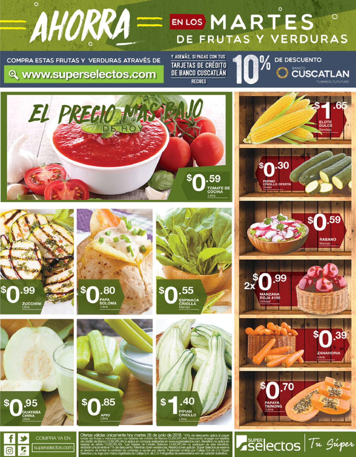 ¡Encuentra las mejores ofertas de frutas y verduras en tu sucursal de Súper Selectos el salvador favorito y en su pagina web www. superselectos. com! este martes 26jun18 muchas ofertas y descuentos para ahorrar y alistar tu alacena.