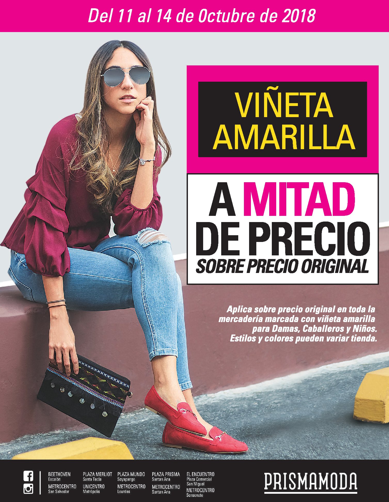 ????¡Viñeta amarilla a mitad de precio, sobre precio regular! En moda, calzado y accesorios para damas, caballeros, niños y niñas! ???? Promoción válida del 11 al 14 de Octubre. ahorra con prima moda el salvador!????