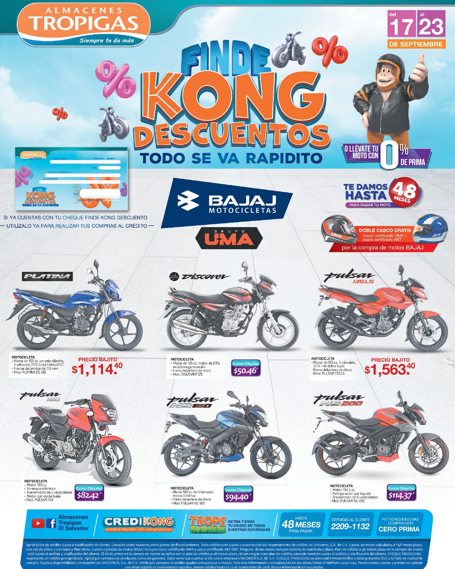 ¡Iniciamos la semana con buenísimas noticias para ti! ???????? Previo al #FindeKongDescuentos queremos que aproveches a llevarte tu MOTO NUEVA a un súper precio. ???? #Tropikong viene repleto de ofertas y te trae lo mejor. Llévate esa MOTO que siempre soñaste con un súper descuento y hasta 48 meses para pagar ????*Restricciones aplican. Promociones válidas del 17 al 23 de septiembre 2018.