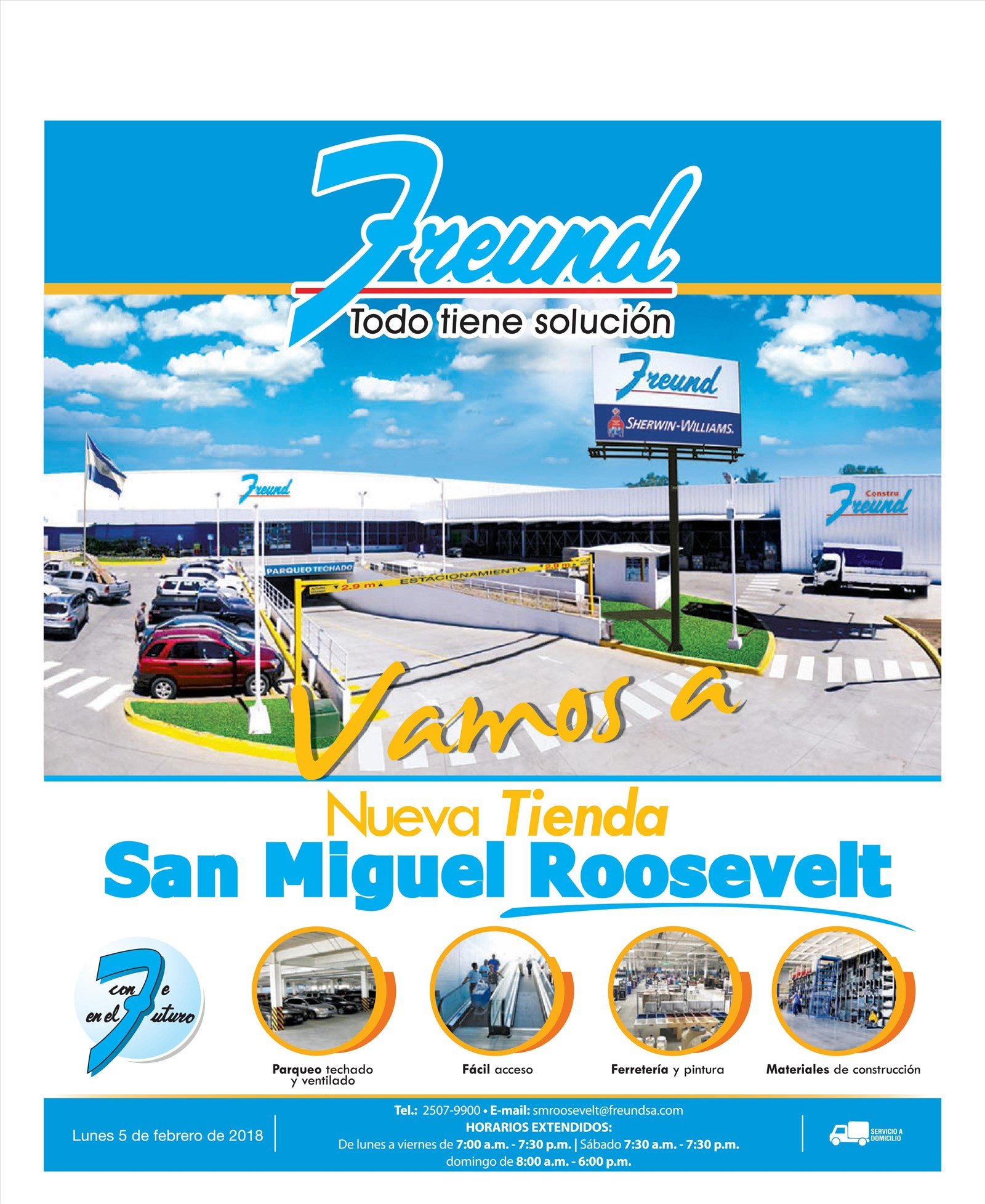 La cadena de tiendas y ferreteria Freund el salvador abre una mega sucursal en el oriente del pais, especificamente en la ciudad de San Miguel. Donde podrna encontrar una amplia gama de herramientas, materiales de construccion, fontaneria, muebles, luminarias, ilimunacion led, ceramica, pinturas, accessorios y lubricantes para vehiculos y mucho mas de 6000 metros cuadrados de un almacene home center whole store.