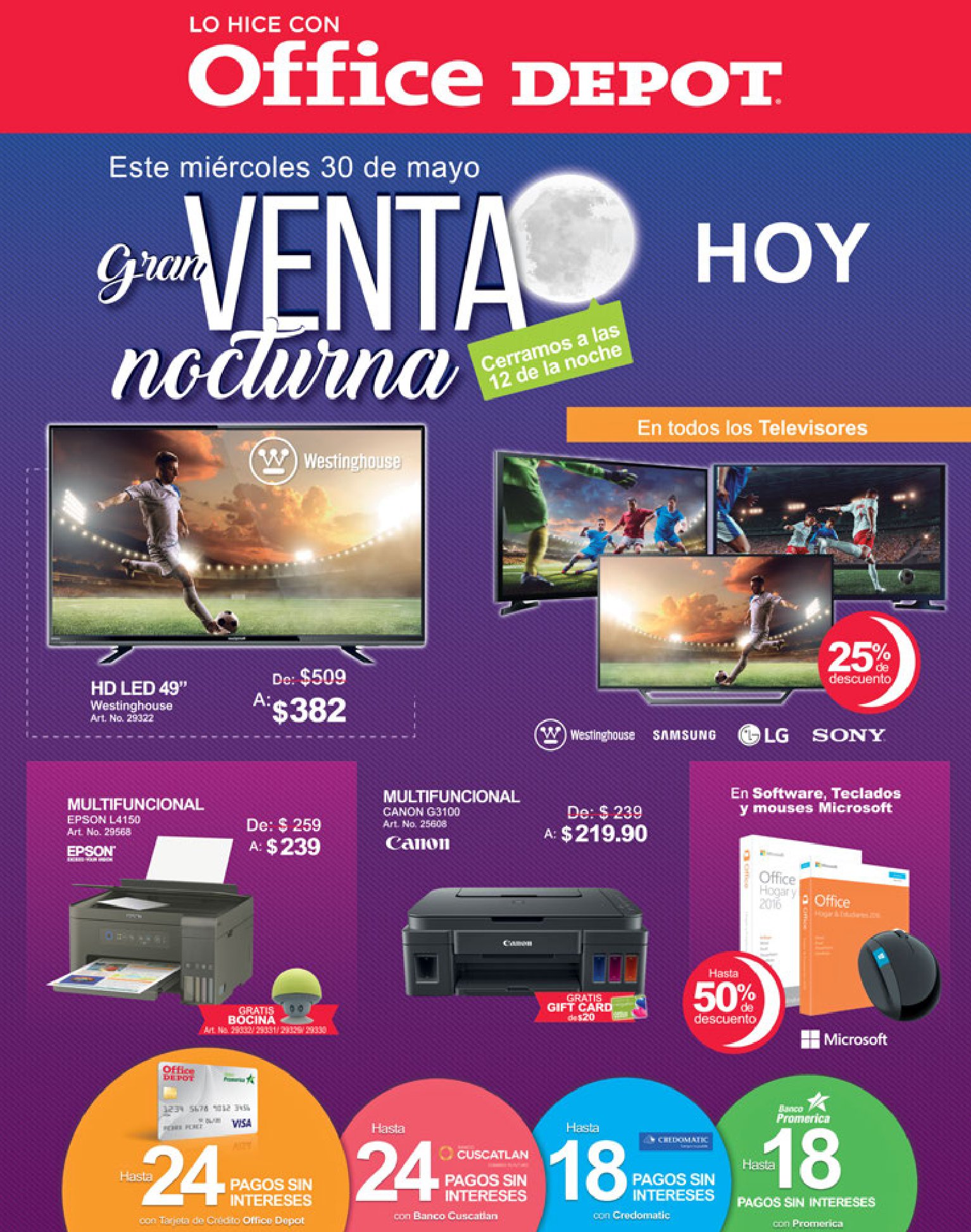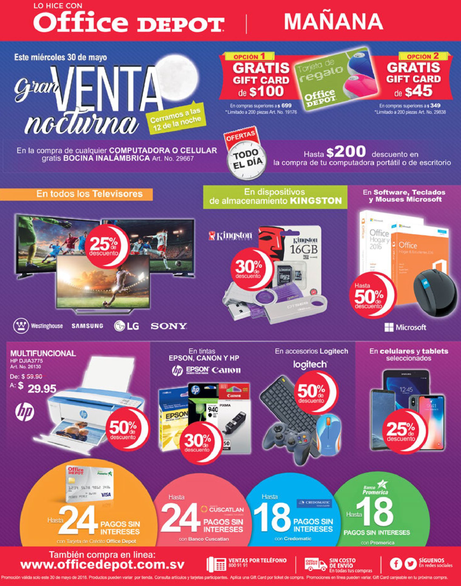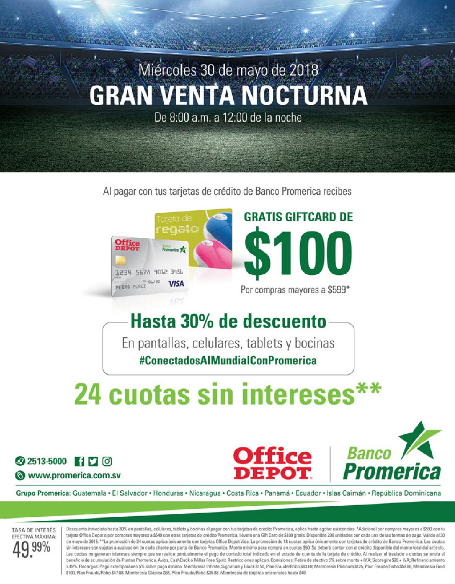 Es momento de usar tu tarjeta de Banco Promerica en la «Gran Venta Nocturna» de Office Depot El Salvador el miércoles 30 de mayo abiertos desde 8:00 a. m. hasta la media noche, recibe 30% de descuento en pantallas, celulares, tabletas y bocinas o si prefieres adquiere tu equipo con 24 cuotas sin intereses. #ConectadosAlMundialConPromerica