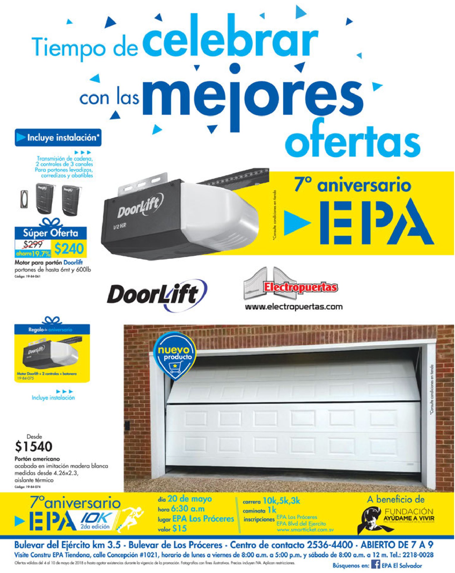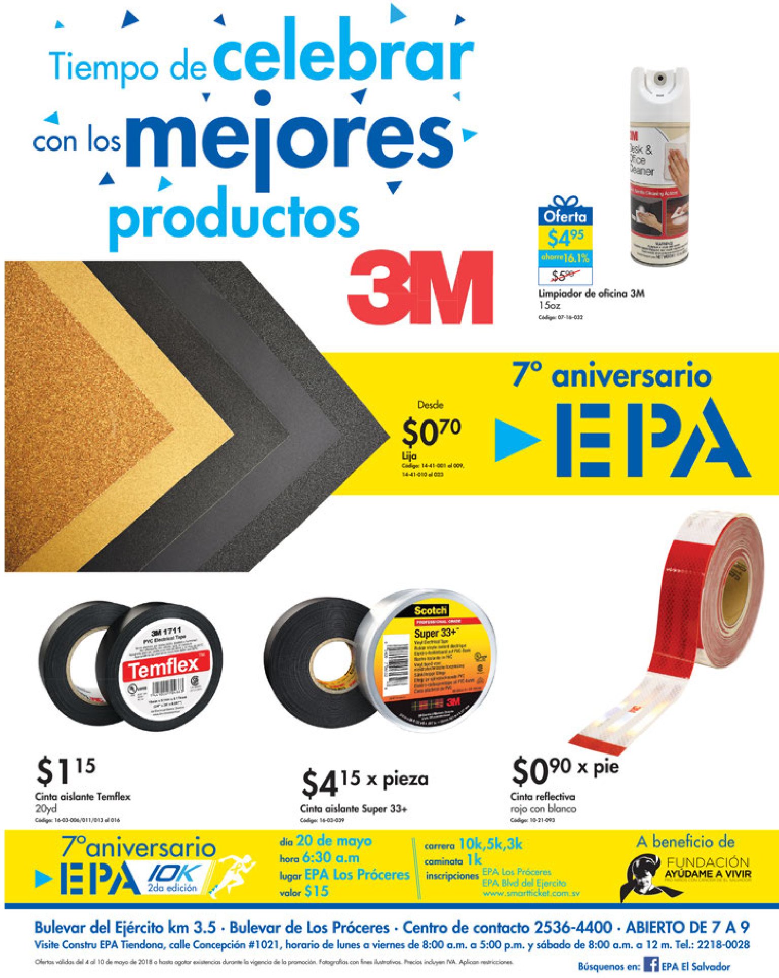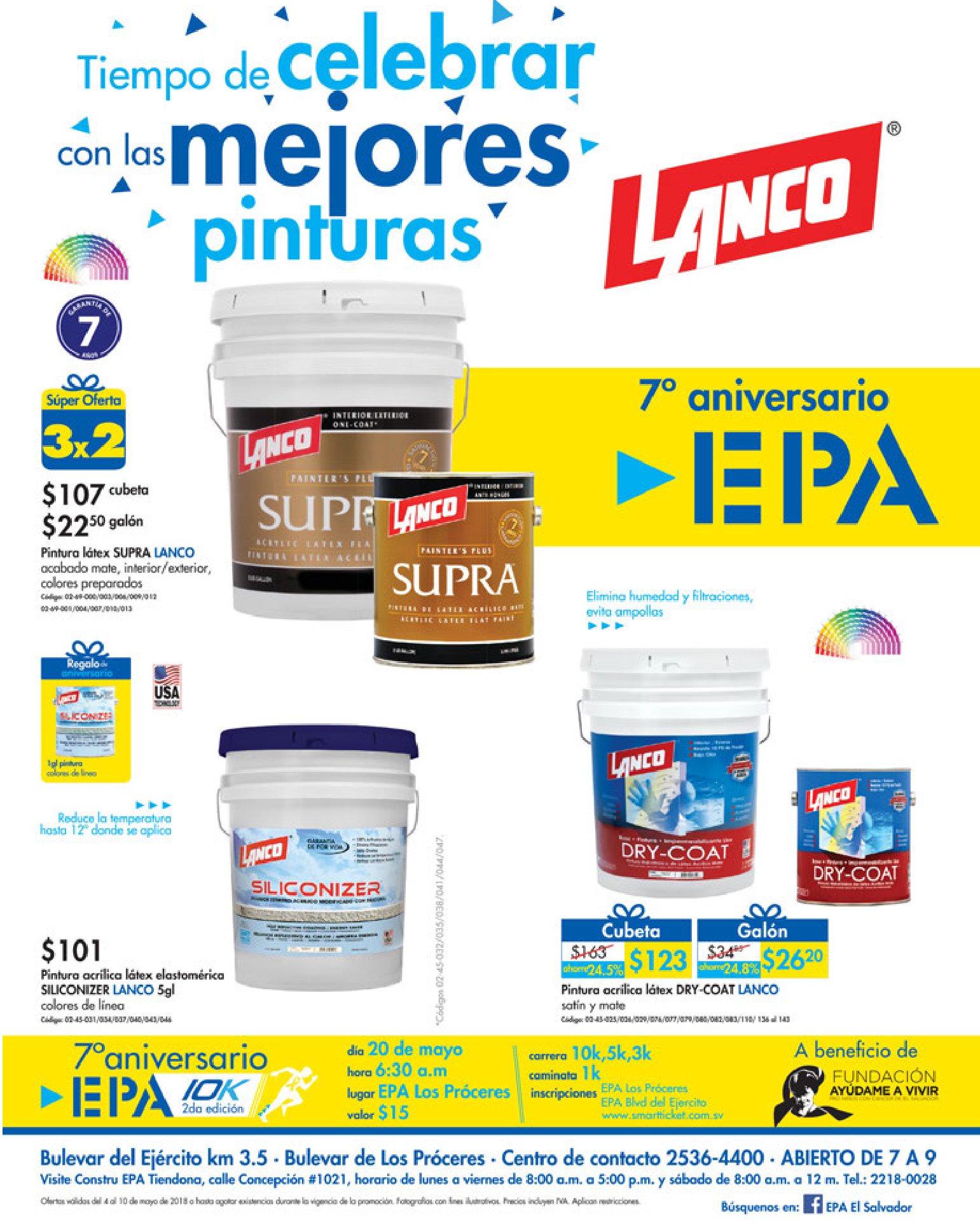 ¡Forme parte de nuestro 7mo Aniversario en la Segunda Edición de la Carrera EPA!????♂️???? Adquiera su Kit por $15.00 en EPA Los Próceres y Bulevar el Ejército o www .smartticket .com.sv/a beneficio de la Fundación Ayúdame a Vivir. Puede elegir entre las categorías 3k, 5k y 10k masculino o femenino y ser uno de los 3 ganadores de premios en efectivo por cada categoría.