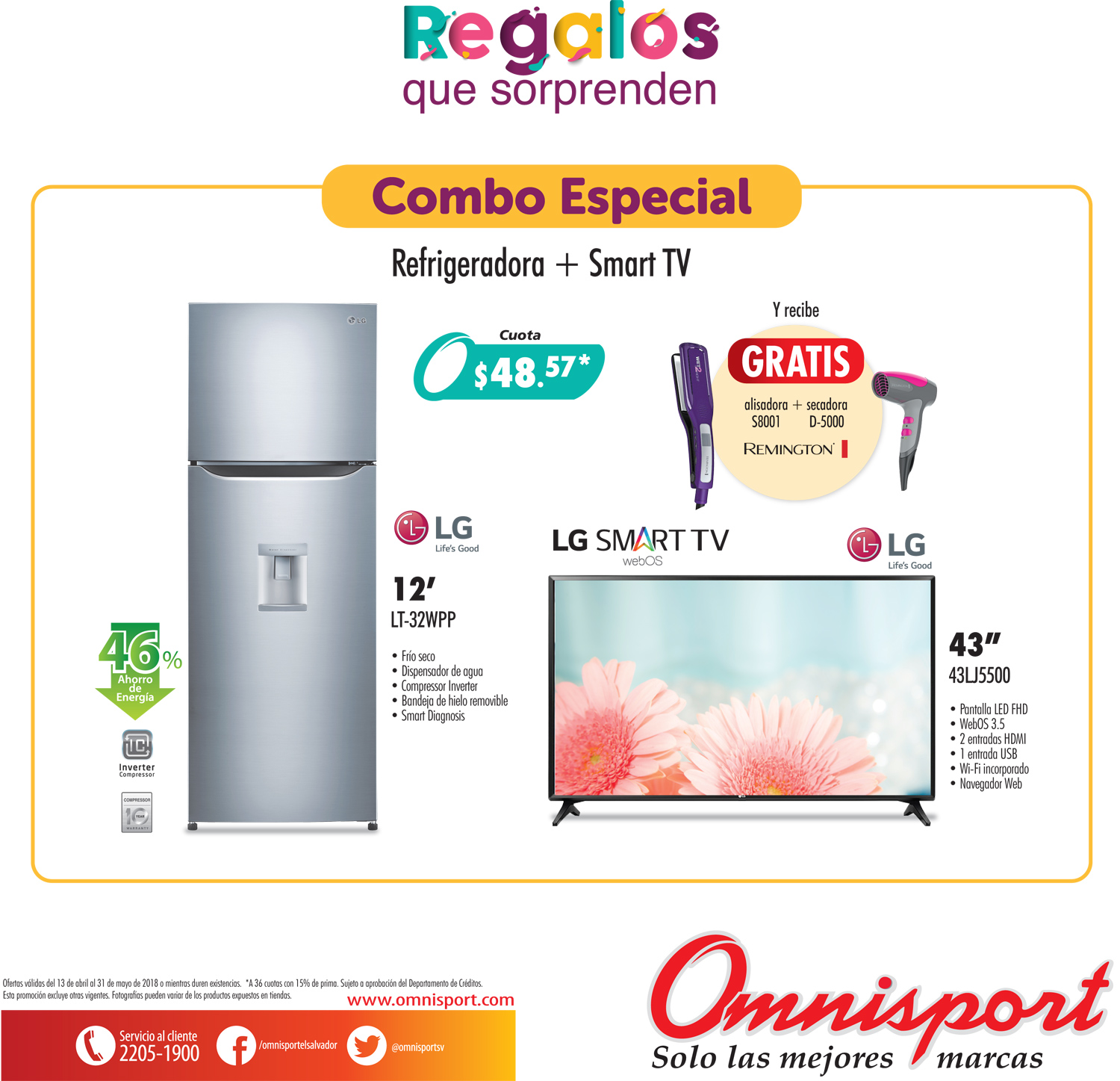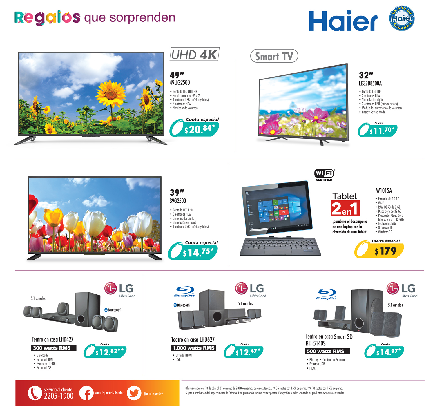 encuéntrala en Omnisport. Ofertas válidas del 26 al 30 de abril de 2018 o mientras duren existencias. ????????Este día quédate en casa y adónde te sientas más cómodo disfruta tu nueva adquisición: la tablet Haier con teclado incluido 🙂 Para que las sigas sorprendiendo, dale el mejor regalo con la línea blanca de Whirlpool de Omnisport. Ofertas válidas del 21 de abril al 13 de mayo de 2018 o mientras duren existencias ????????Este día quédate en casa y adónde te sientas más cómodo disfruta tu nueva adquisición: la tablet Haier con teclado incluido 🙂 Renueva tu cocina en www .omnisport. com donde aprovechas los 12 meses sin intereses de tarjetas de crédito de Banco Promerica. Promoción válida al 30 de abril de 2018 o mientras duren existencias. Una gran renovación para tu cocina con el chinero Continental. Crea ondas en tu cabello como los profesionales y sorprende a todos en la oficina con tu nuevo look.