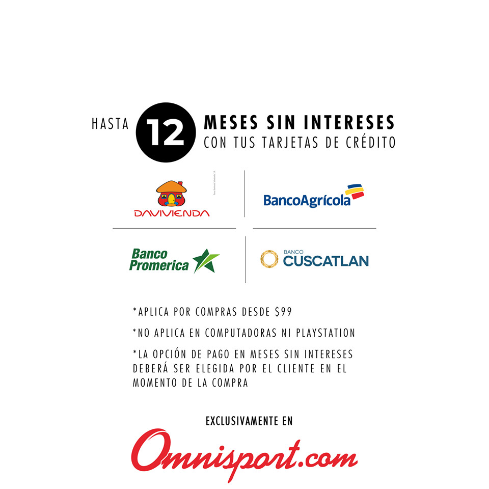 Aplican cuotas sin intereses a 3, 6, 9 y 12 meses con tarjetas de crédito de Banco Davivienda, CUSCATLAN, Promerica y Agrícola. La opción de pago en meses sin intereses deberá ser elegida por el cliente en el momento de la compra. Válido por compras desde $99. No aplica en computadoras ni PlayStation. Máximo 2 productos por cliente. Esta promoción excluye otras vigentes. Una opción diaria para regalar.