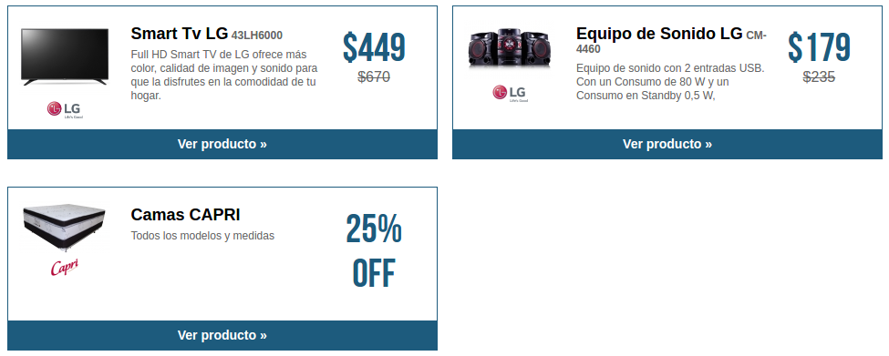 ¡Exclusiva web! Entra a omnisport[dot]com y llévate pantallas, camas y más hasta con un 30% de descuento con 12 cuotas sin intereses. La freidora sin aceite Black+Decker y tú son nuestros invitados especiales para la gran fiesta de Omnisport. La lavadora LG cuenta con 33 lbs.de capacidad 3 discos agitadores y una tina rotativa. ¡Celebremos juntos los precios bajos! ONLINE shopping exclusive Tiendas OMNISPORT del 8 al 11 de Septiembre