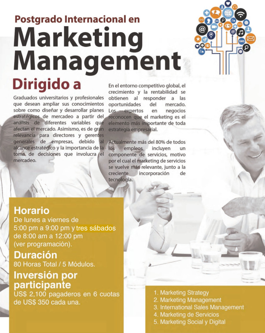 El Postgrado Internacional en Marketing Management está dirigido a: Directores, Gerentes y profesionales que desean ampliar sus conocimientos sobre como diseñar y desarrollar planes estratégicos de mercadeo a partir del análisis de diferentes variables que afectan el mercado.
