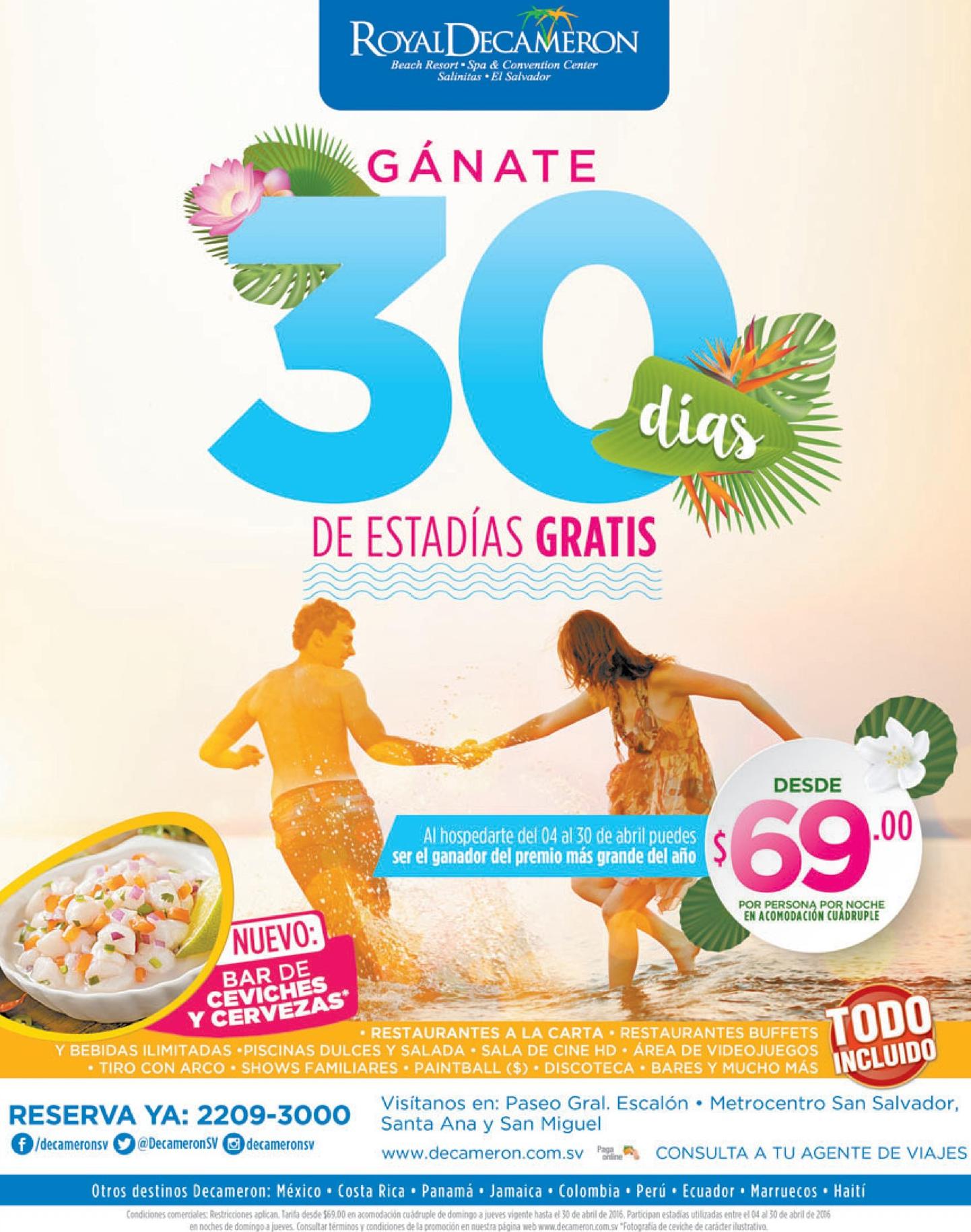 Iniciamos la semana y las promociones del mes de abril (04-abr-16), no te quedes sin las ganas de probar el Bar de ceviche sy cervezas en tu estaia DECAMERON por 69 dolares.