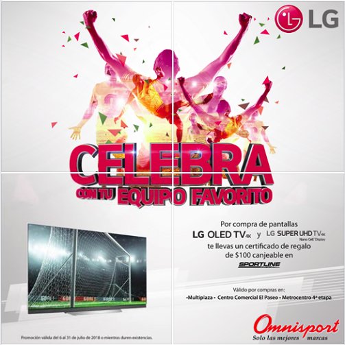Aprovecha este certificado de regalo por $100 de SPORTLINE al comprar pantallas OLED y SÚPER HD en las siguientes sucursales Omnisport: Centro Comercial Multiplaza Centro Comercial El Paseo Metrocentro 4ª etapa Promoción válida del 6 al 31 de julio de 2018 o mientras duren existencias.