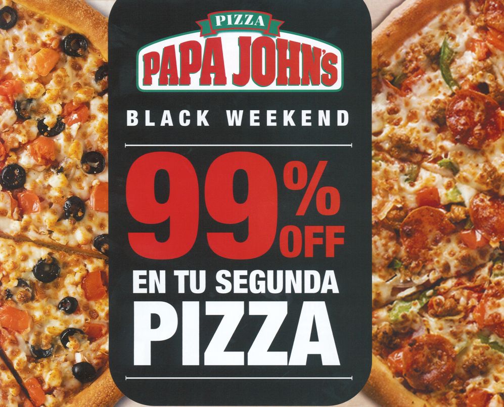 El #BlackFriday llega tambien a restaurantes con descuentos de locura, como por ejemplo el 99% OFF en la segunda PIZZA Papa Johns; las expectativas son muchas y muy grandes para el dia de mañana, porque celebraremos una fiesta de precios bajos y promociones inolvidables con el Viernes Negro 2015, por esta razón te enviamos otro adelanto de Descuento BLACK FRIDAY 2015 de los almacenes mas prestigiosos del pais.