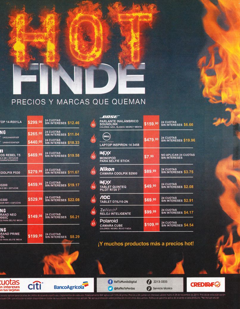 Todos los clientes podran disfrutar en sus restaurantes preferidas de varias opciones de ofertas con toda su familia, The green house por ejemplo tendra SALE de desayunos al 2×1. Para los que gustan de Taco no podran dejar pasar esta opcion del TACO FRIDAY de restaurante La Campana cualquier especialidad por solo $0.50 centavos de dollar. Puedes visitar ademas los sandwich QUIZNOS y pedir tu combo agrandado completamente GRATIS. «Tiendas RAF presenta su HOT FINDE 2015 precios ardientes» «Electronica Japonesa el savador presenta su BLACK WEEKEND sale» «DEALS big pot playing now SEARS store» «Hasta 75 OFF de descuentos BLACKfriday2015 de PRADO el salvador» «El unico y verdadero BLACK FINDe lo encuentras en PRADO sv» «Los mejores precios en electrodomesticos este proximo VIERNES negro 2015» «Black DAYS Almacen ACOSA te hace las cosas mas facil en tecnologia – 26nov15» «Cheers for friends party 40 OFF via banco agricola» «Descuento credomatic en el viernes negro 2015» «Solo PAPA JOHNS te da tu segunda pizza con 99 OFF BlackFriday2015» «Escoge tu producto y conce su precio HOT Finde RAF el salvador»